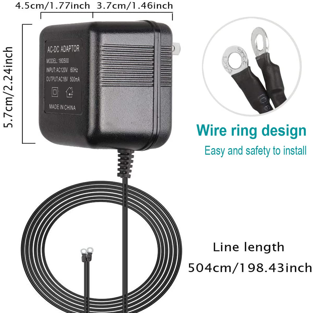MORE INFO: Input: AC 120V 60Hz; Output: AC 18V 500mA; Wire Cord length: 5M / 16.4 feet.