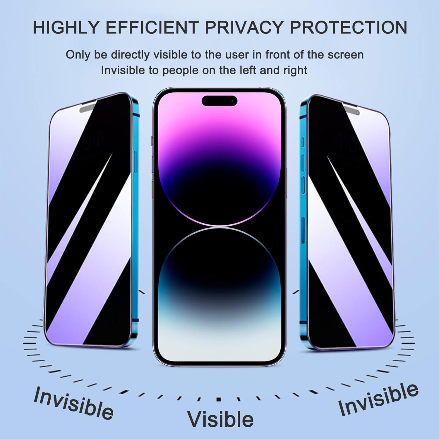 [Highly Efficient Privacy Protection]: This privacy tempered glass screen protector for iPhone 14 Pro Max is only visible to the user directly in front of the screen, invisible to people on the left an right, efficiently protects your personal private information from strangers around and doesn’t effect your view of the screen.