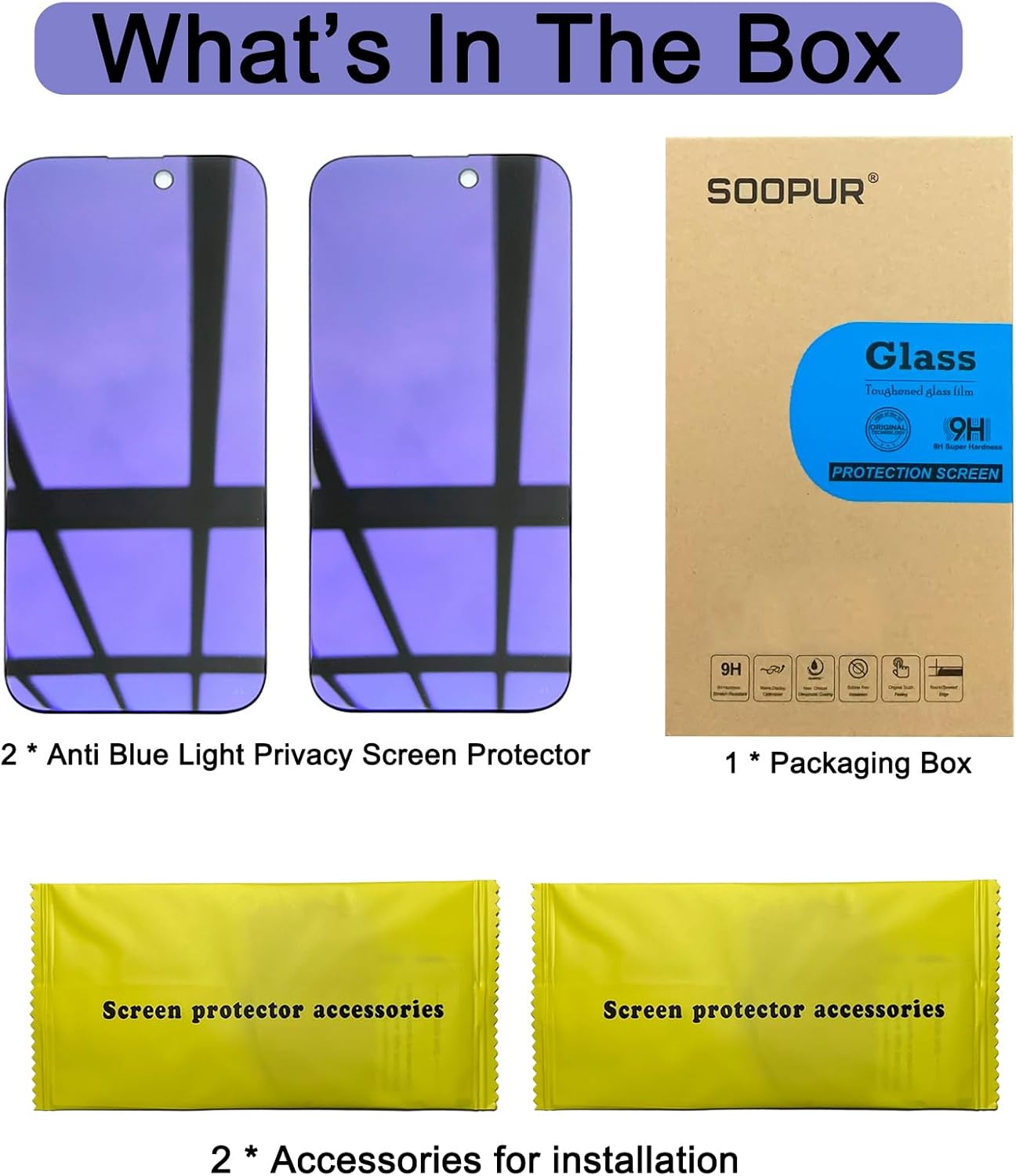 [Distinctive Tempered Glass Screen Protector]: This SOOPUR screen protector has 2 functions in 1 which are privacy protection and anti-blue light eye protection. And the amazing bluish purple tint is quite aesthetically pleasing and eye-catching.