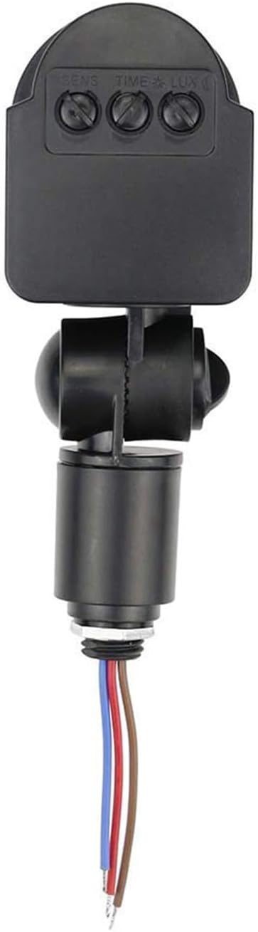 Technical Specifications: Wiring – Brown (L+/120-277VAC), Blue (N), Red (LAMP) per IEC 60446. Detection – 10m range, 140°×90° coverage, adjustable 8s-10min response. Electrical – 12VDC ±10%, 30W resistive/15W inductive load, 3× inrush protection. Environment – -20℃ to +60℃, IP44, EN 55015/61000-3-2 compliant. Compatible with incandescent/LED/CFL (IEC 60598-1), halogen up to 300W, and low-voltage DC lighting.