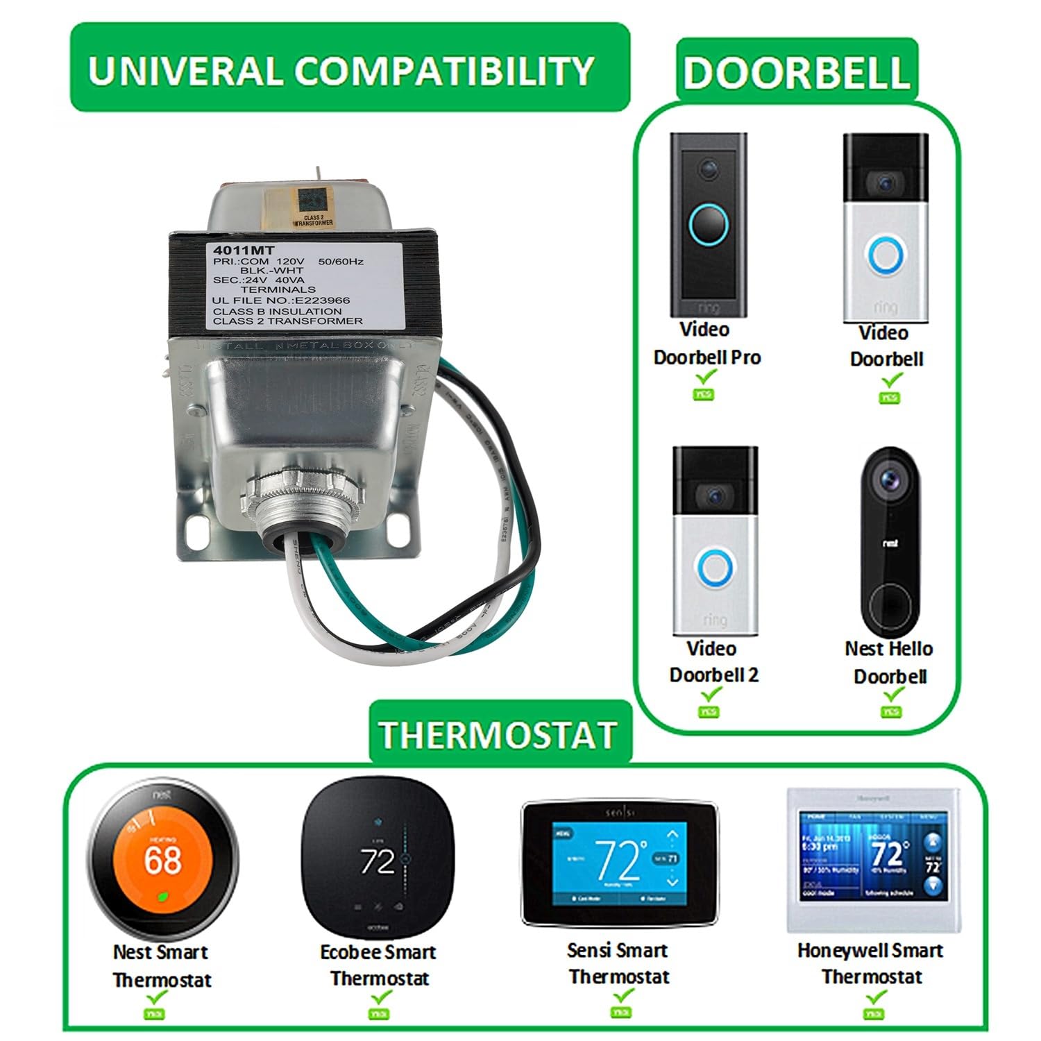 This 24 V transformer fits for Honeywell and Sensi smart thermostats; Nest, Ecobee,Also fit for Ring Video Doorbell, Ring Video Doorbell 2, Ring Video Doorbell Pro, Nest Skybell Doorbell, and other devices that require constant 24 volt power for operation