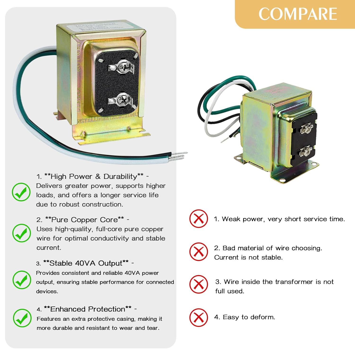CLEAR COMPATIBILITY & USE GUIDE: This 24V 40VA transformer is designed for standard **wired** low-voltage devices. COMPATIBLE WITH: Ring Video Doorbell Pro (1st & 2nd Gen), 3, 4; Nest Hello; Ecobee; Honeywell; Sensi thermostats. NOT FOR: Battery-only doorbells (e.g., Ring Battery Doorbell Plus) or devices requiring over 40VA. *Please check your device’s specs and wiring before purchase*