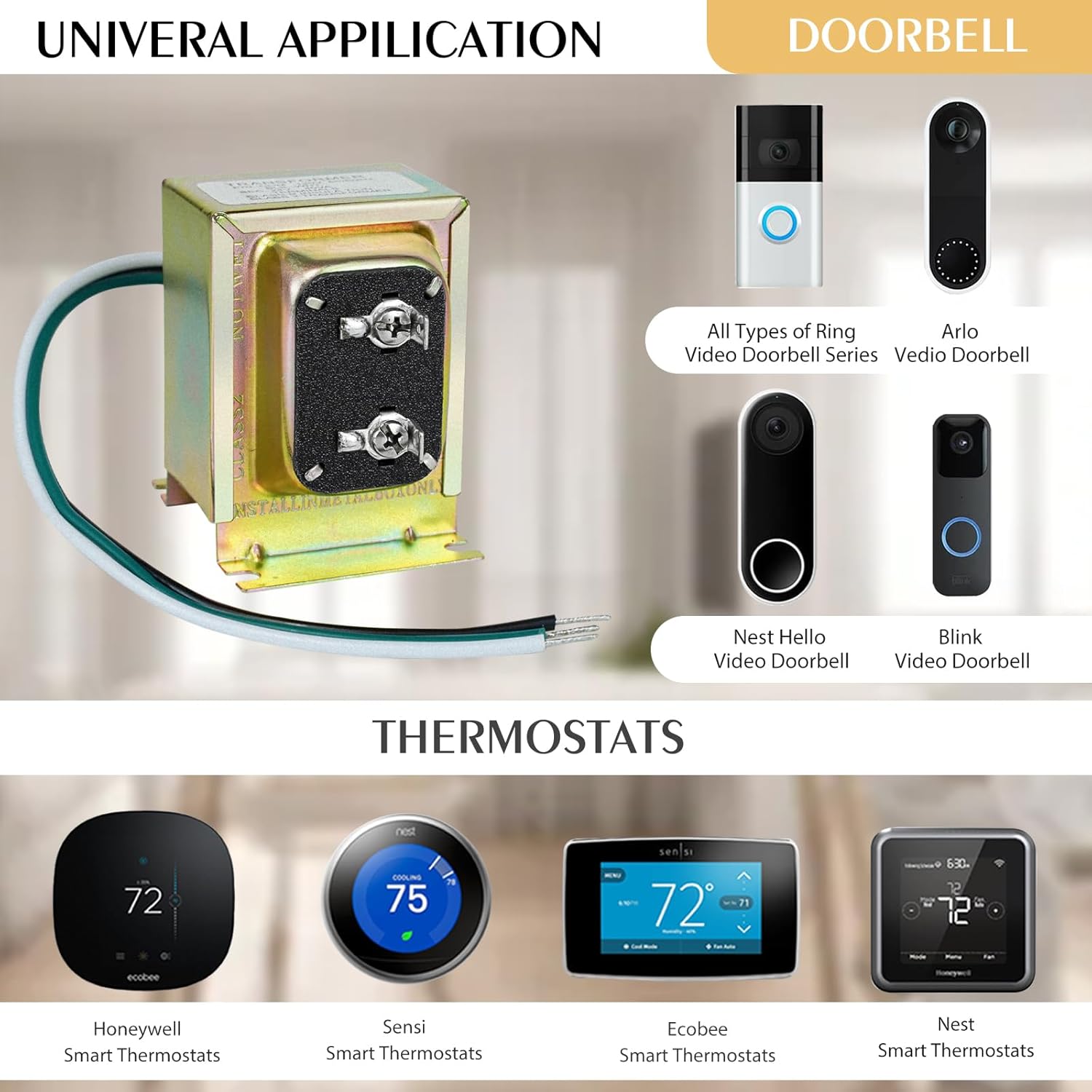 Universal Compatibility: In addition to Ring products, this transformer is widely compatible with other popular smart thermostats and doorbells, including Nest, Ecobee, Honeywell, and Sensi. It is also suitable for any device that requires constant 24-volt power, making it a versatile replacement for most North American doorbell transformers