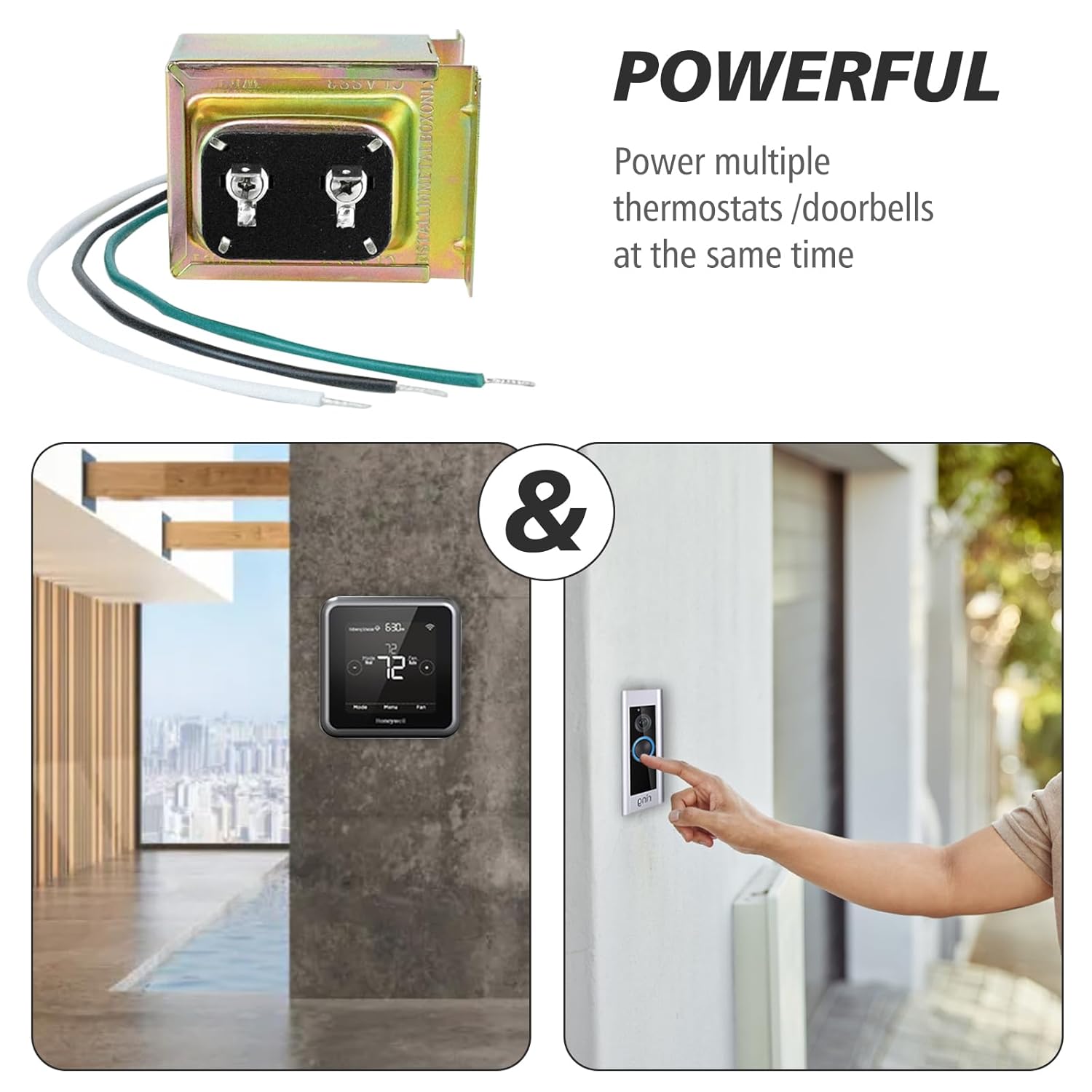 Compatible with a wide range of smart thermostats including Nest, Ecobee, Honeywell, and Sensi, as well as other devices that require a 24-volt power supply, this transformer ensures stable power delivery for multiple devices at once.
