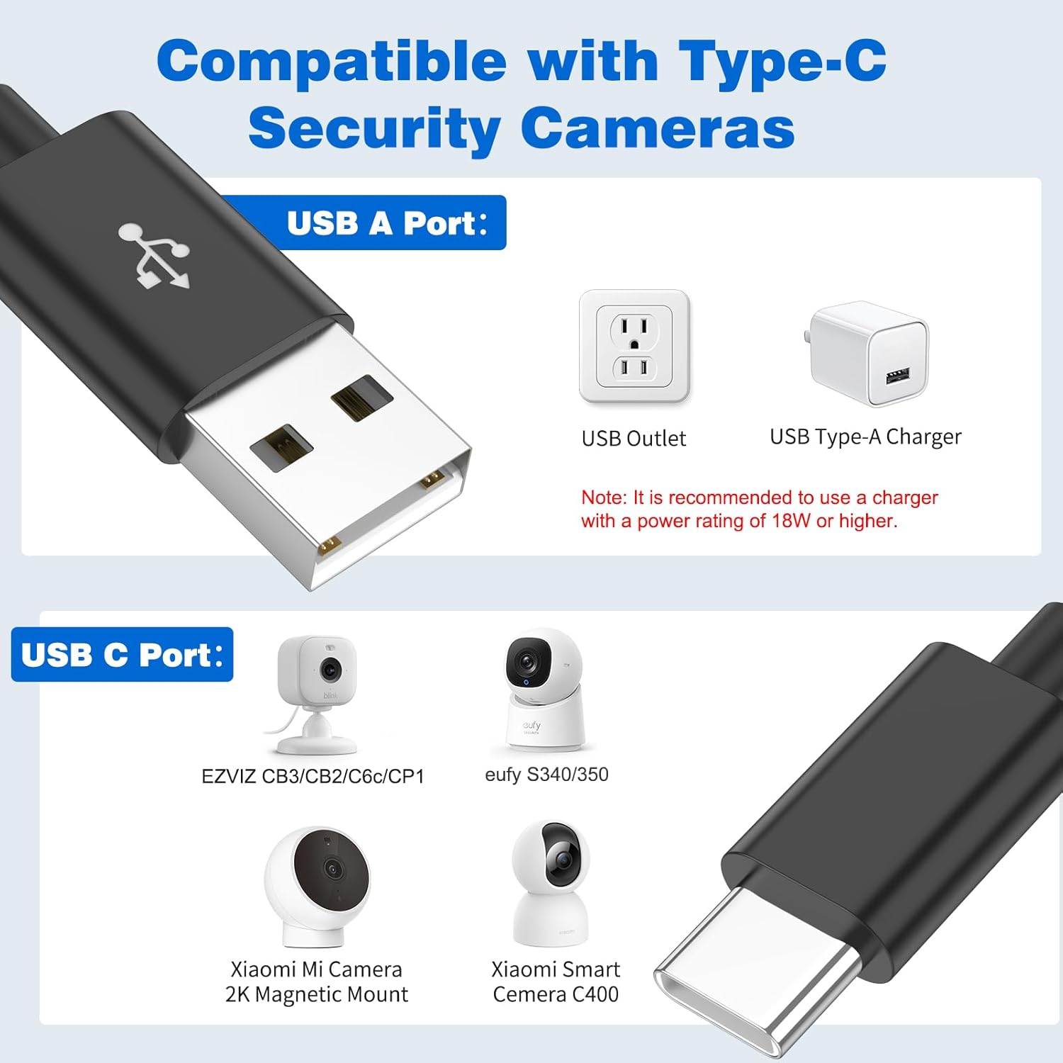 24 Hours Uninterrupted Charging: USB to USB C cable specifically designed for home security cameras, providing stable charging power to keep your security cameras running day and night