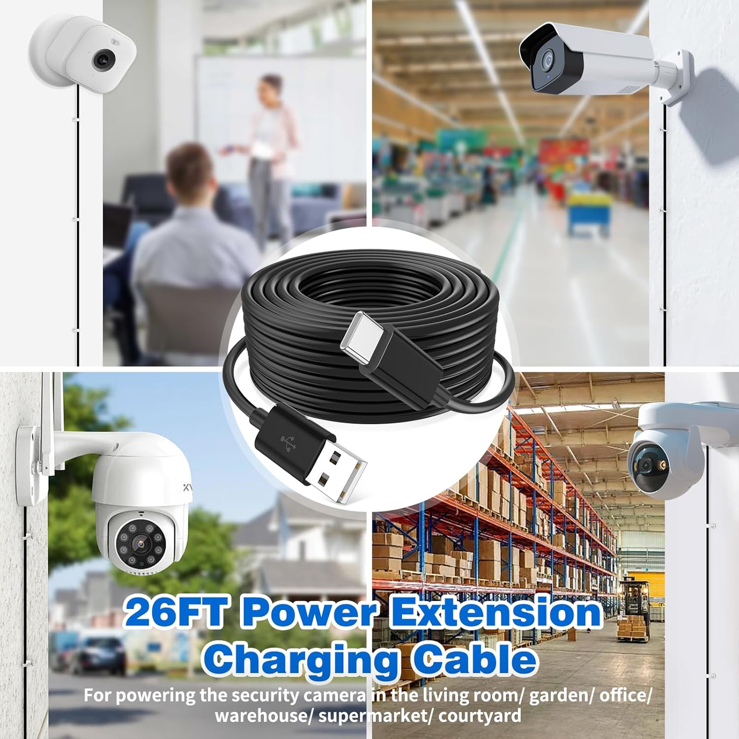 26FT Extra Long Design: USB Type C Cable length sufficiently powers cameras at extended distances, ideal for homes, villas, courtyards, schools, companies, warehouses, offices, parking lots, etc. Power your camera anywhere