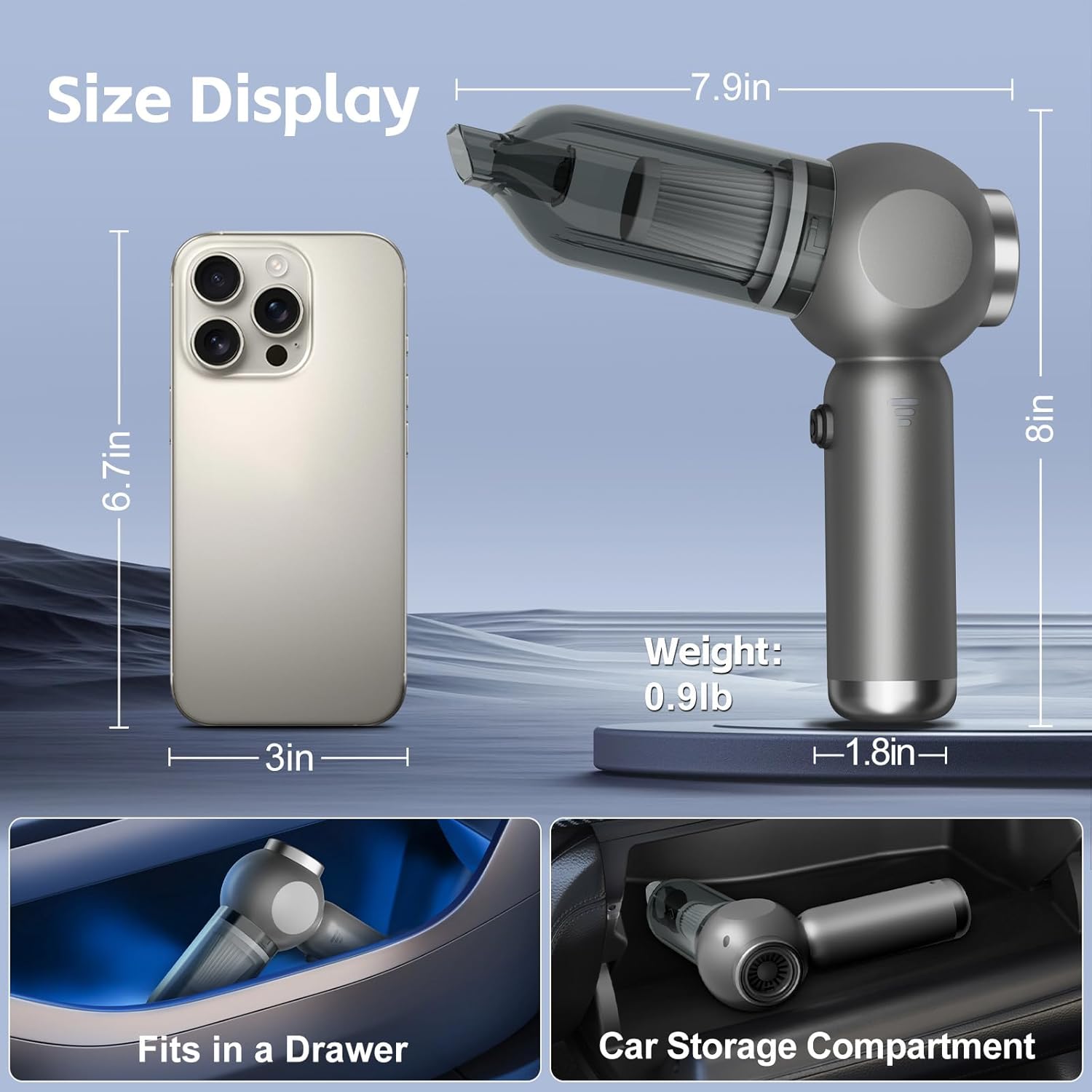 【6-in-1 Vacuum+Blower+Inflator+】More than a car vacuum portable cordless! This handheld car vacuum blasts dust from computer keyboards, inflates air mattresses/party balloons, cleans sofa crevices, and compresses storage bags. Ditch 5 tools – this mini car vacuum cleaner handles 90% of home & car jobs!
