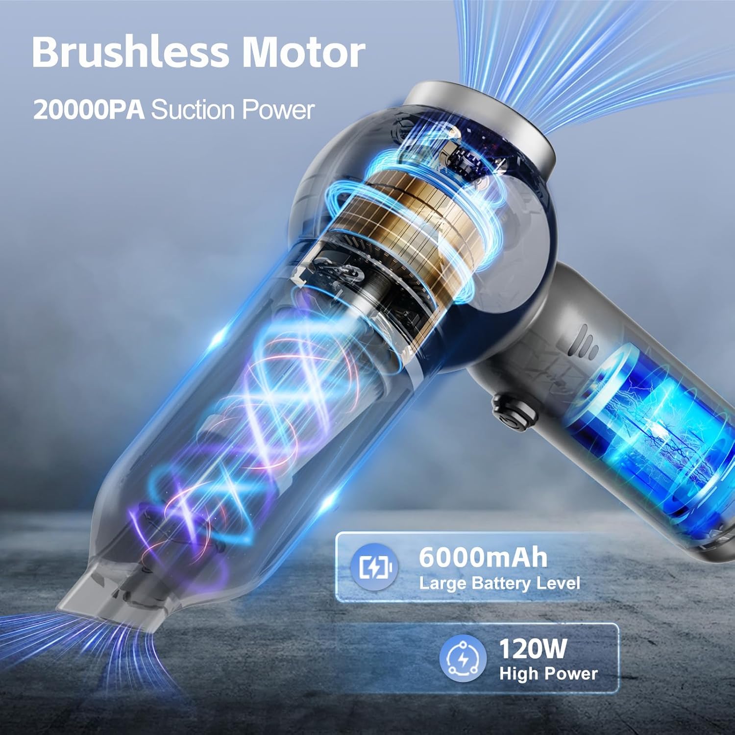 【Dust-Busting 20KPA Suction & Smart Modes】Conquer stubborn debris with industrial-grade suction! Our brushless motor delivers 3 adjustable powers (20KPA Max/15KPA/10KPA) to annihilate embedded car dirt with this car interior vacuum cleaner, tackle pet hair in carpets, and even cereal crumbs in kitchen corners. This small car vacuum cordless rechargeable can achieve clean in minutes!An awesome Christmas gift for car lover If you’re struggling to decide on a gift.