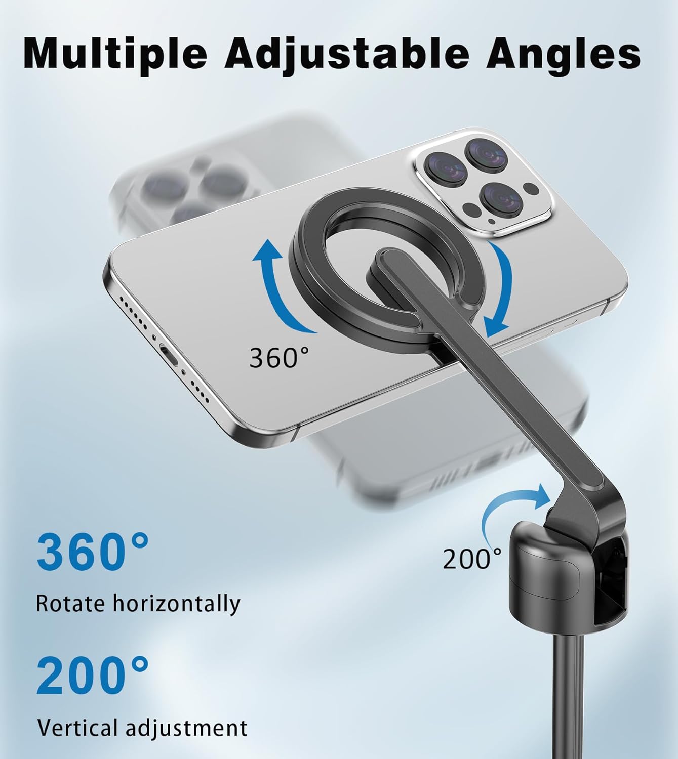 Magnetic Tripod for MagSafe – Selfie stick tripod is designed with magnetic suction to easily hold phones for MagSafe without the need for a clamp, non-magnetic phones need to be used with a metal ring (included in the package). The versatility of the magnetic phone tripod makes it suitable for travel, video, conference, live streaming and photography, tripod can make your shooting more convenient, stable and fun, perfect for selfies, video recording, live streaming and family gatherings.