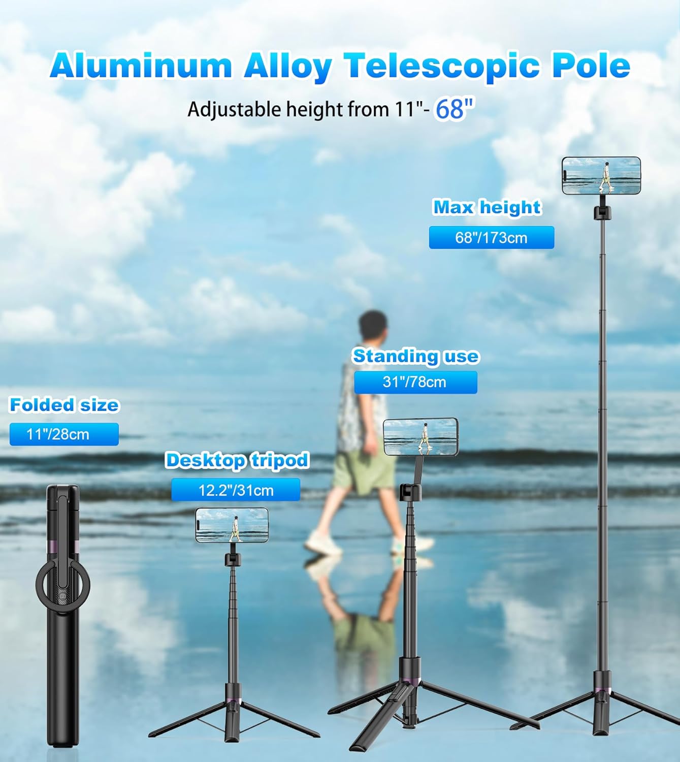 3 in 1/Easy to Use – Selfie stick tripod is designed with one-touch unlocking, just press the button on the bottom of tripod and pull telescopic rod. Cell phone tripod consists of 8 sections of retractable rods, the height can be adjusted from 10.8in to 68in, magnetic phone mount ring can hold up to 500g, and can be flexible to take great photos at different heights. You also can switch between desktop tripod, floor tripod and selfie stick modes to easily meet your different shooting needs.