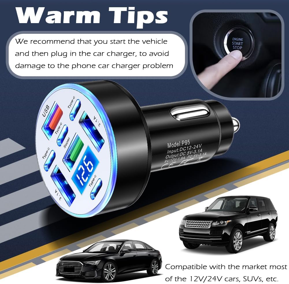 Warm Tips: This phone car charger with 12-24V input voltage, compatible with the market most of the 12V/24V cars, SUVs, etc., we recommend that you start the vehicle and then plug in the car charger, to avoid damage to the phone car charger problem