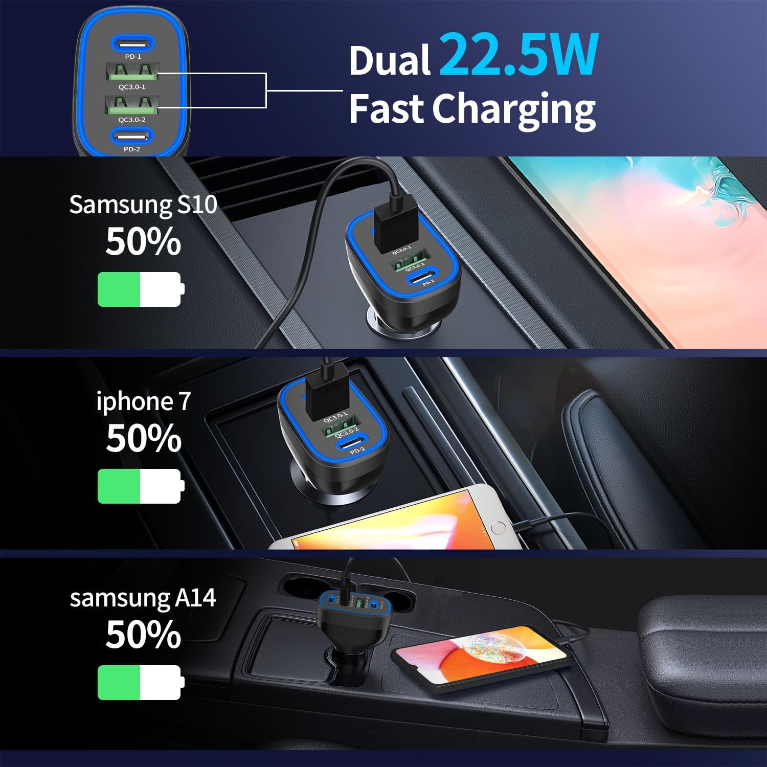 90W multi port Super Fast Car Charger: Dual PD ports have 45W high output,it supports to charge two Samsung galaxy S25 from 0% to 70% in just 30 minutes; dual QC 3.0 port 18W output,it charges most of android devices from 0% to 50% within 30 minutes