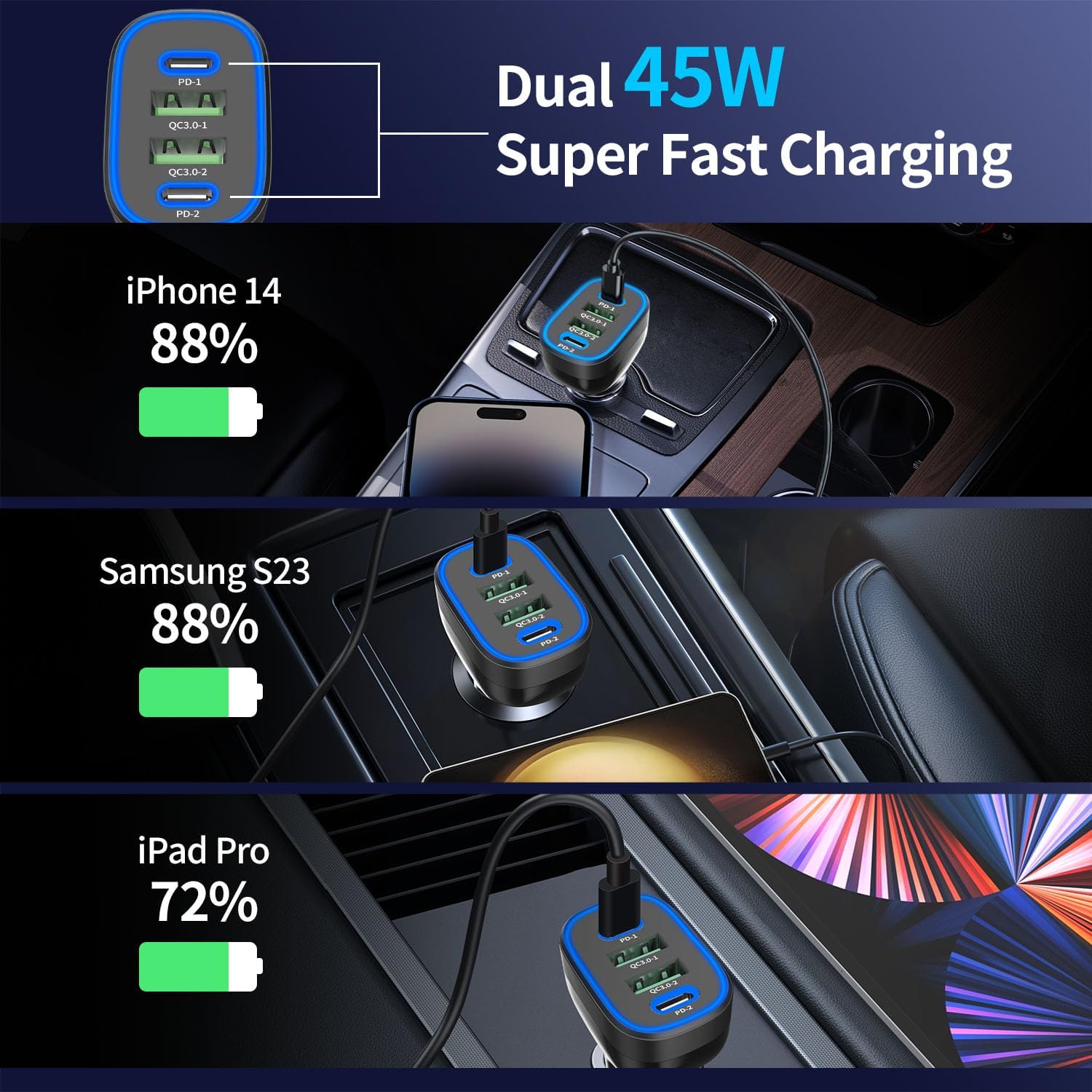 90W multi port Super Fast Car Charger: Dual PD ports have 45W high output,it supports to charge two Samsung galaxy S25 from 0% to 70% in just 30 minutes; dual QC 3.0 port 18W output,it charges most of android devices from 0% to 50% within 30 minutes