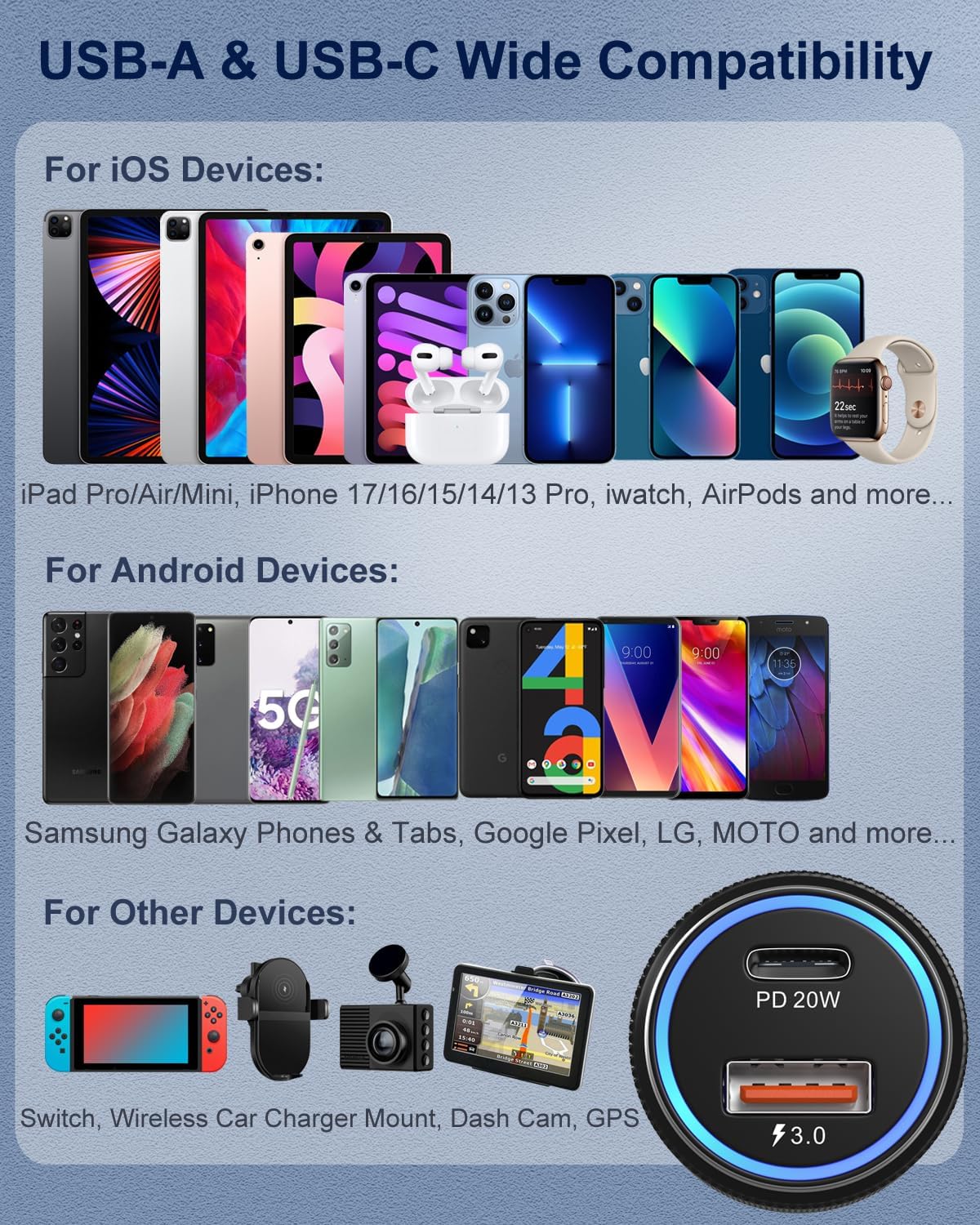 【USB-A + USB-C Wide Compatibility】: Perfect compatible for iPhone 16e/16 Pro Max/16 Pro/16 Plus/16/15/15 Plus/15 Pro/15 Pro Max/14/14 Plus/14 Pro/14 Pro Max/13/13 Pro/13 Pro Max/13 Mini/SE 3/12/12 Pro/12 Pro Max/12 Mini/11/XR/XS/X/8 Plus. iPad Mini/Air/Pro, AirPods Pro/Max, iwatch 10 9 8 7 6 SE. Compatible for Samsung Galaxy S25/S24/S23/S22/S21/S20, Galaxy Note 20/10/9/8, Google Pixel 9/8/7/7A/6/5/4A/4XL/3, LG G8/G8X/G8s, Switch, Portable Power Bank, Earbuds, Smartwatches and more devices.