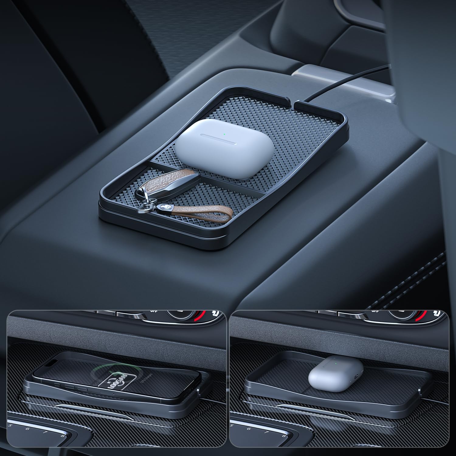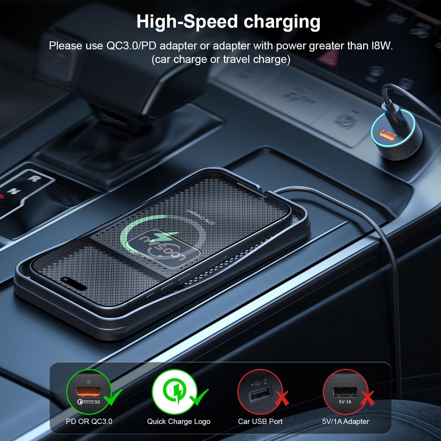 💡【Important Tips】1. The vehicle socket (USB/Type-A) may not provide sufficient power. For best performance, use the included 20W PD adapter. 2. Metal cases or accessories such as MagSafe magnets, magnets, credit cards, holders, or pop-up sockets may block the signal or cause overheating. Do not place them between the device and the charger. 3. The wireless charging pad is slightly larger to accommodate most phones, and smaller models may have more space. Before purchasing, please check the size of your vehicle’s center console or armrest to ensure compatibility.