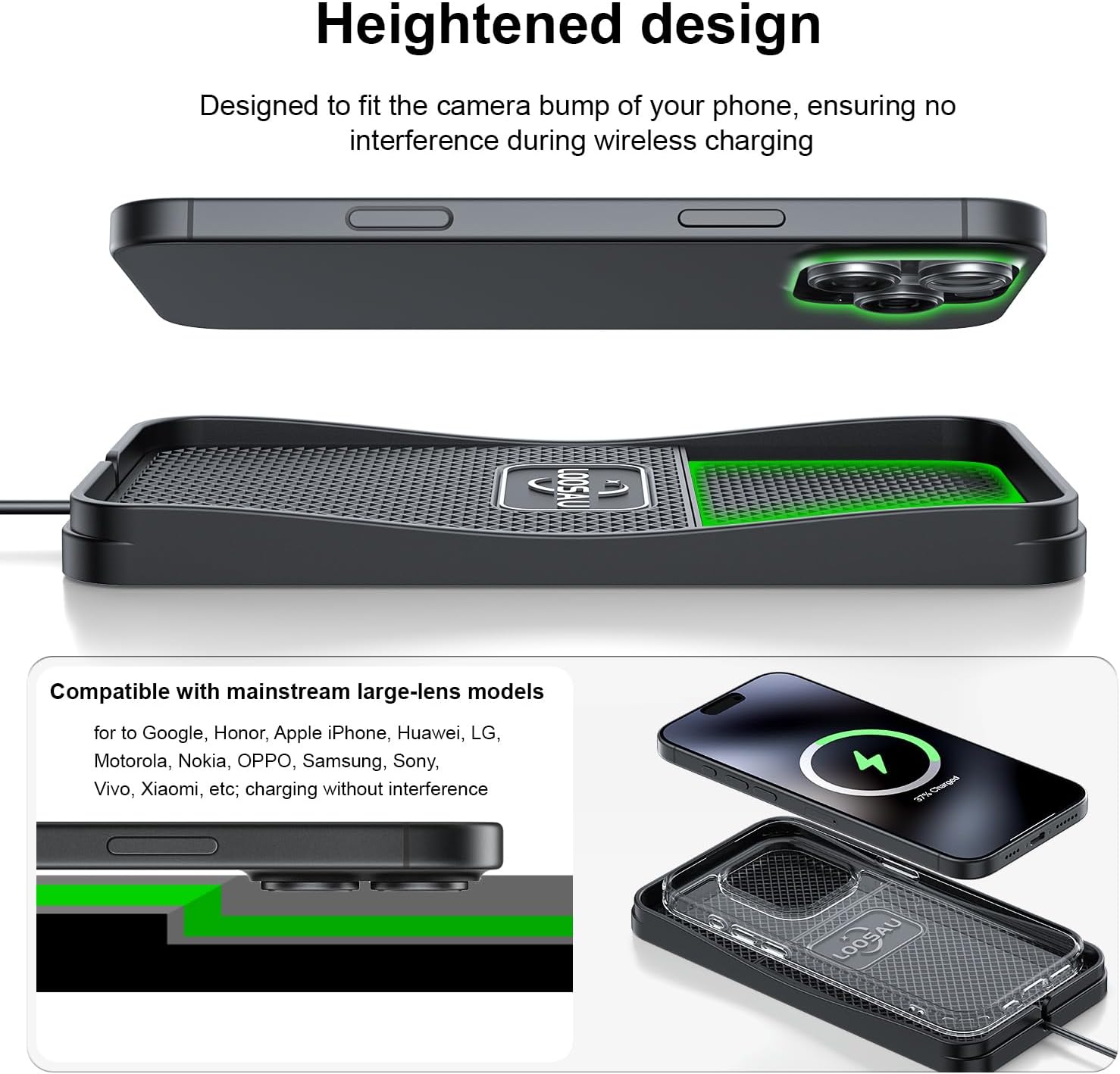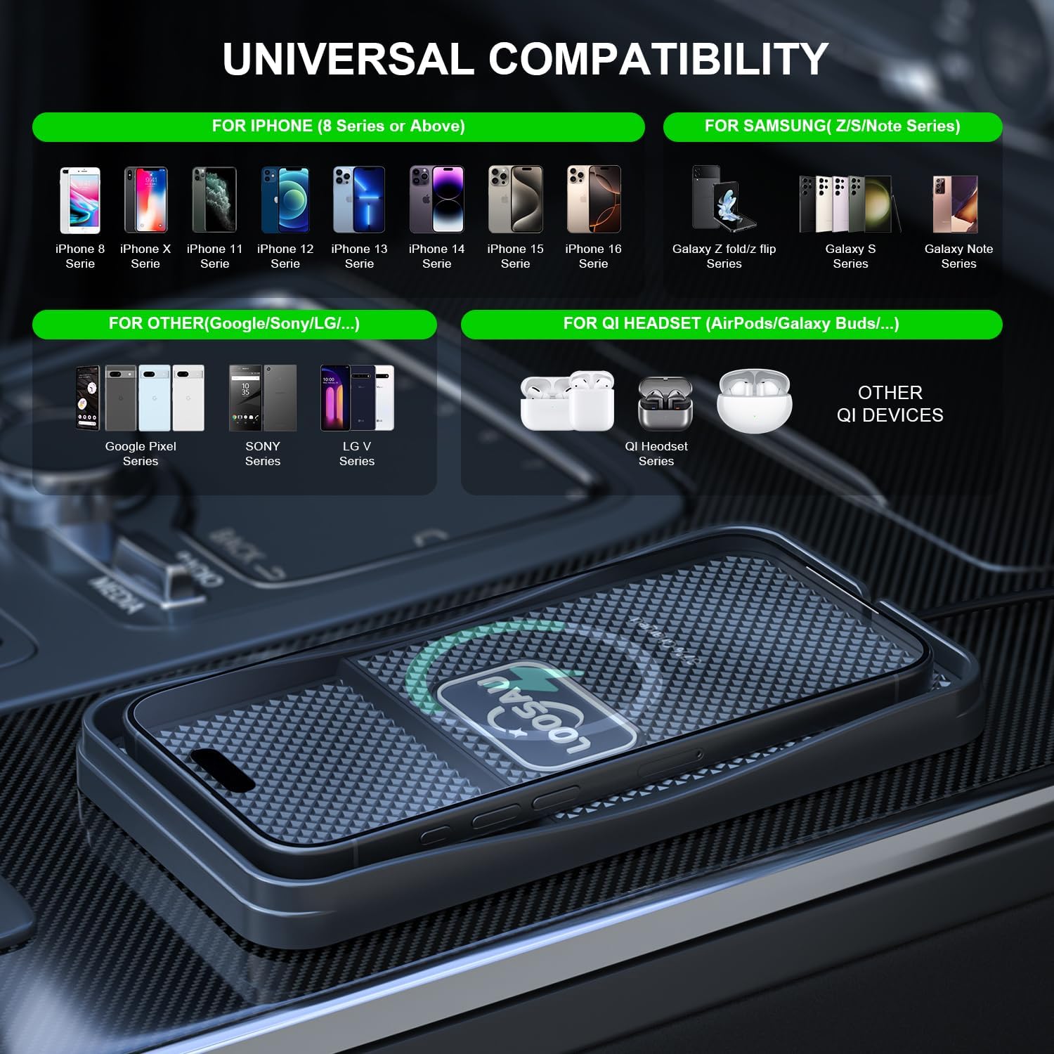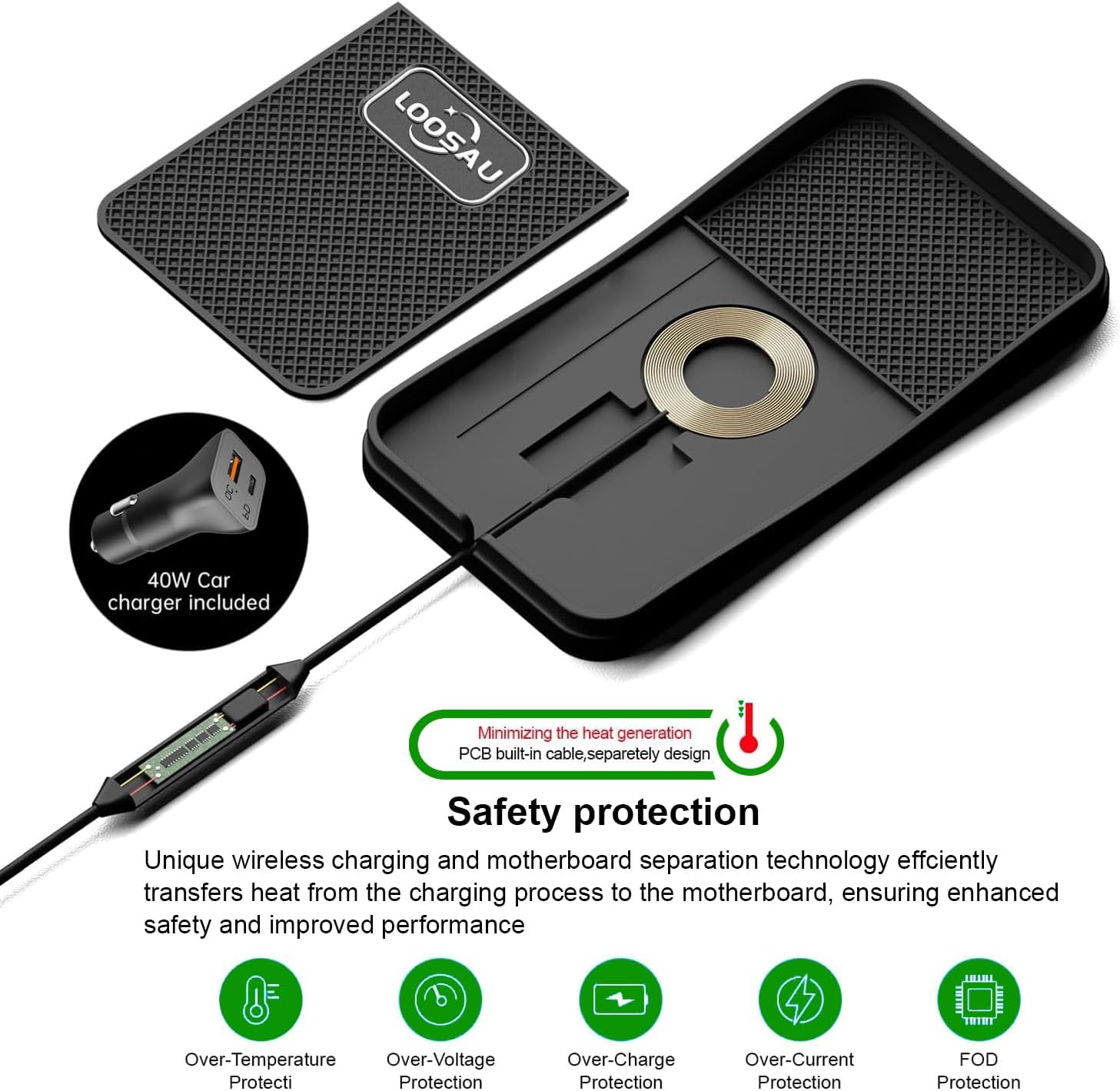 💡【Efficient and Safe】LOOSAU wireless car charger combines advanced wireless charging technology and motherboard separation design to effectively conduct the heat generated during charging to the motherboard, ensuring optimal performance and improving safety. It also has comprehensive protection functions such as over-temperature protection, over-voltage protection, over-charge protection, over-current protection and foreign object detection (FOD), providing a safe, reliable and efficient charging experience for your device.
