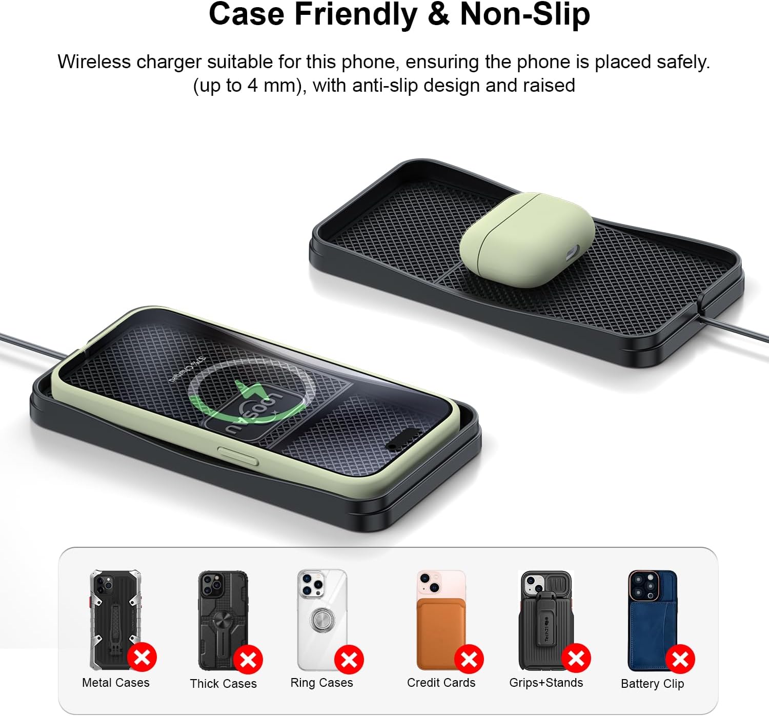 💡【Higher Design, Case-Friendly】This wireless car charger adopts a higher structure to effectively prevent camera collision interference, ensuring a perfect fit for efficient and reliable charging. Its case-friendly design allows easy use without removing the case, with a thickness of up to 4mm. Fully compatible with iPhone and other smartphones with protruding cameras, the silicone non-slip surface keeps the phone stable even on bumpy roads, providing a safe and reliable wireless car phone charging experience.
