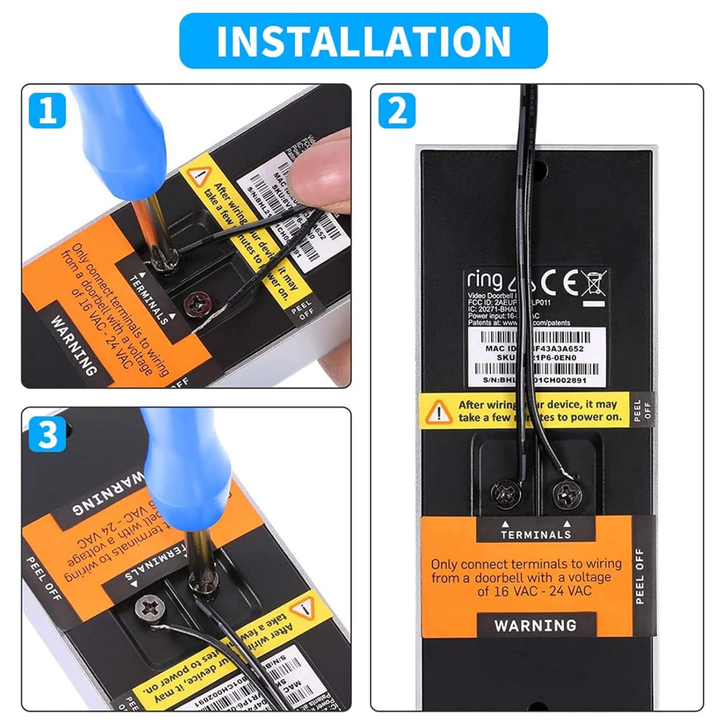 Doorbell power supply Installation method: Connect the two ring terminals to the screws on the back of the doorbell. The wire loop design makes installation easier and helps ensure that the adapter is securely attached to the doorbell. The wire is strong and flexible enough not to tear