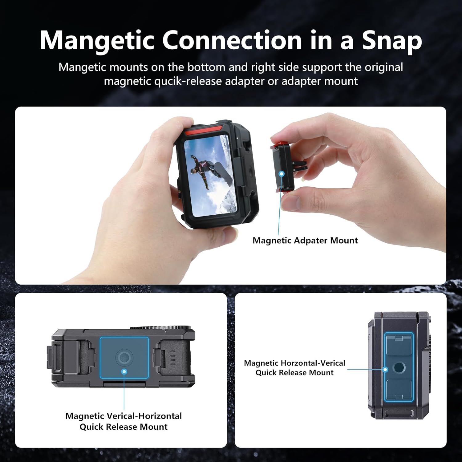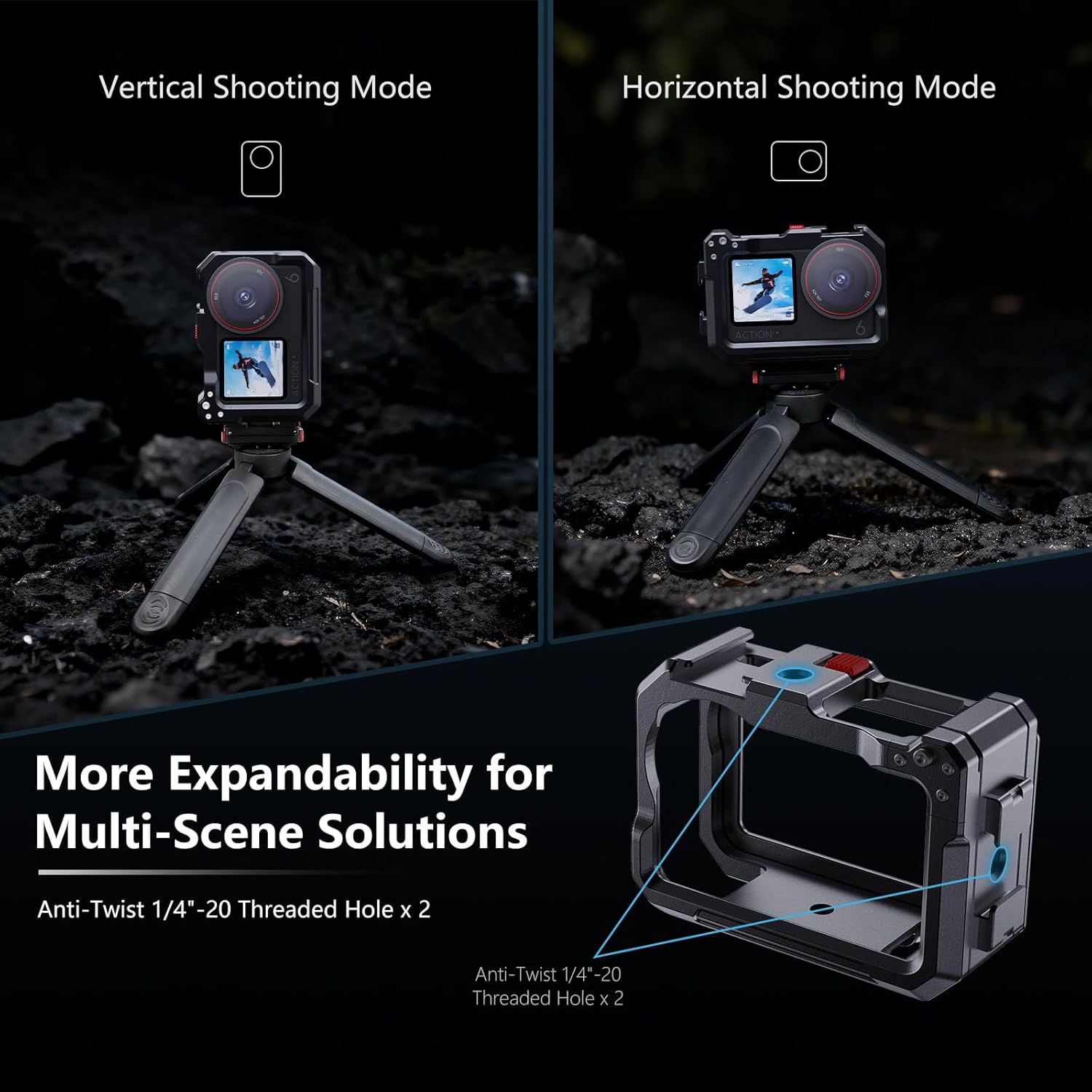 Multiple Mounts: The metal frame hollowed bottom allows the Osmo Action 6 camera to be used normally with the quick-release adapter. There is an extra quick-release mount on battery side, and 1/4 Threaded on the battery side and the top of the case; The top of the metal case also comes with a cold-shoe mount. With a wide compatibility design, we can easily fit with our cycling mounts, adapters, or selfie sticks