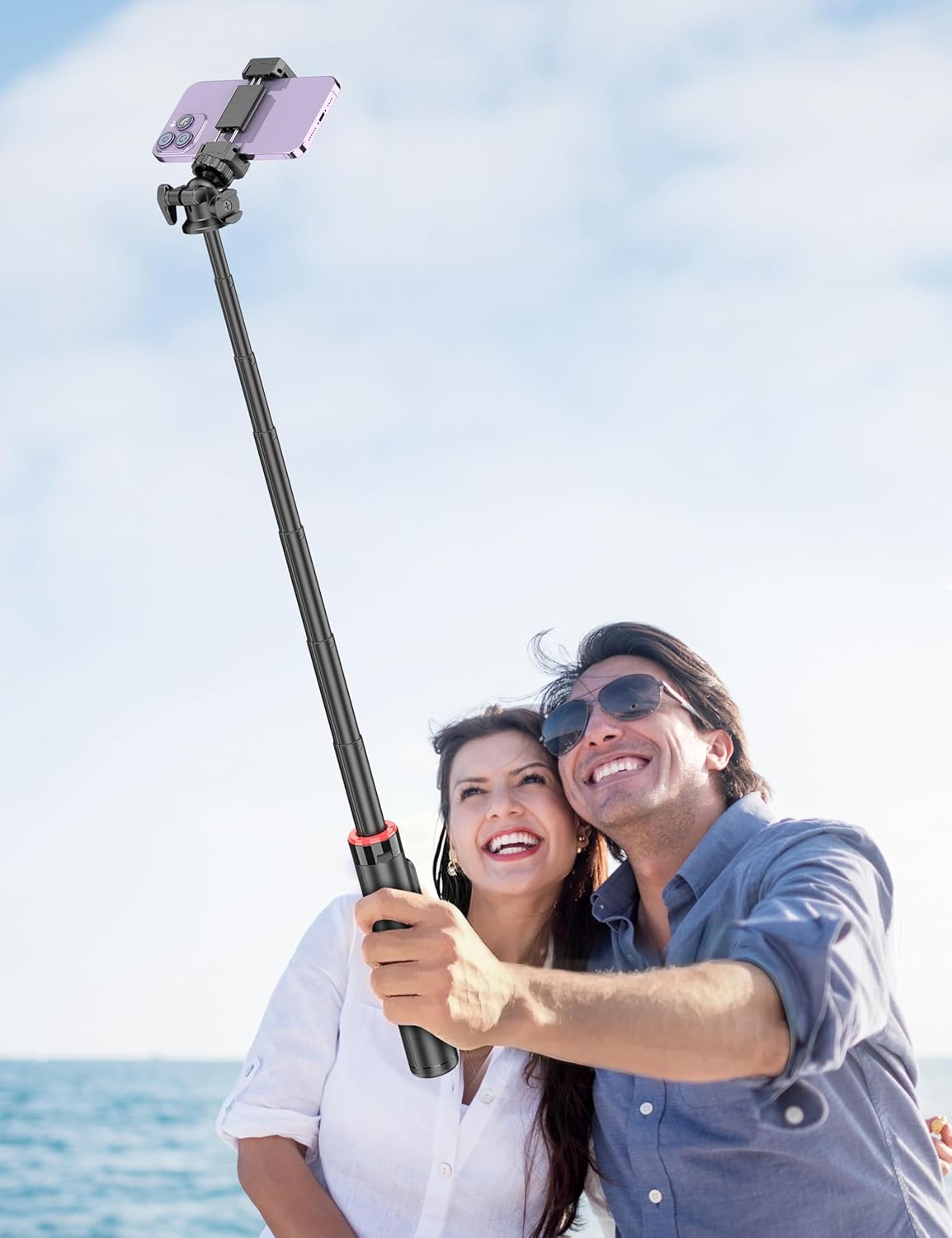 360° ROTATABLE & DETACHABLE REMOTE: Cell phone tripod the specially designed ball-head can rotate 360° degree, free photo angle to meet your daily shooting needs. Has a built-in rechargeable wireless remote control,supports shooting within 30 ft(10 m) is compatible with iPhone/android, quickly realizes pairing. When the remote control is not in use, it can be put into the special remote control slot on the handle of the selfie stick to prevent it from being lost