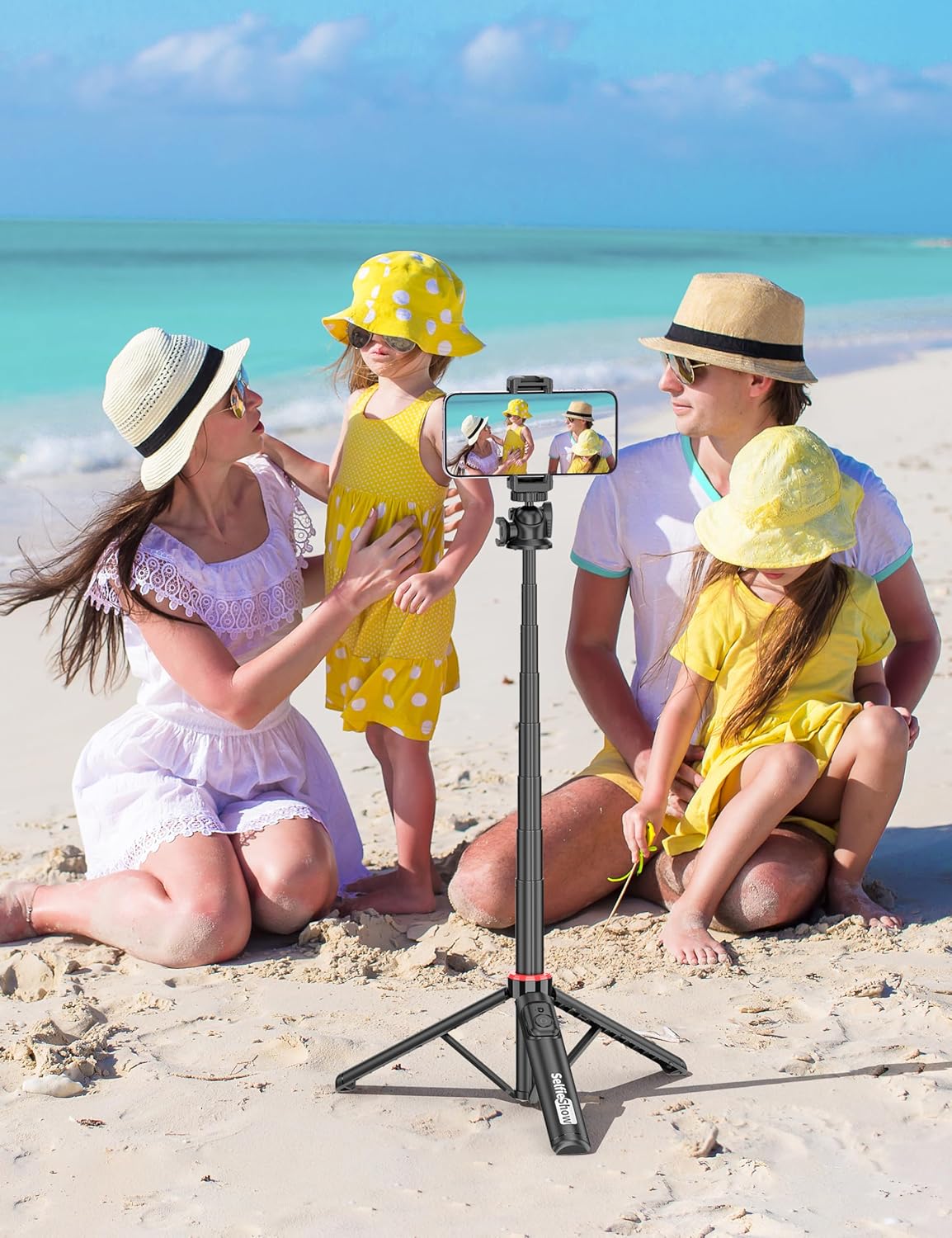 49″ ADJUSTABLE TRIPOD FOR PHONE: The tripod for phone consists of a 7-section retractable aluminum alloy pole that the aluminum alloy ensures wear and corrosion resistance, can be quickly adjusted from 9.8″ (25 cm) to 49″ (126 cm) height, providing the flexibility to take photos at different heights and angles. Therefore, needs of people who want to have different shoot heights and apply it in different scenes, even for the tall. It can also facilitate group pictures of many people