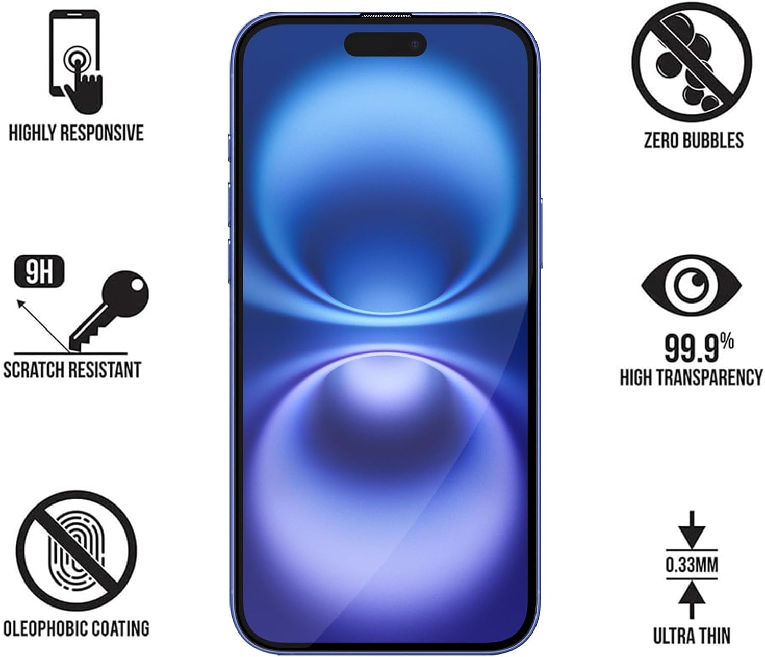 【2.5D curved black edge Full-Screen Coverage Design】The iPhone 16 glass screen protector it features a specially designed 1:1 2.5D curved black edge that perfectly wraps around every curve of the screento protect your screen from scratches and damage.