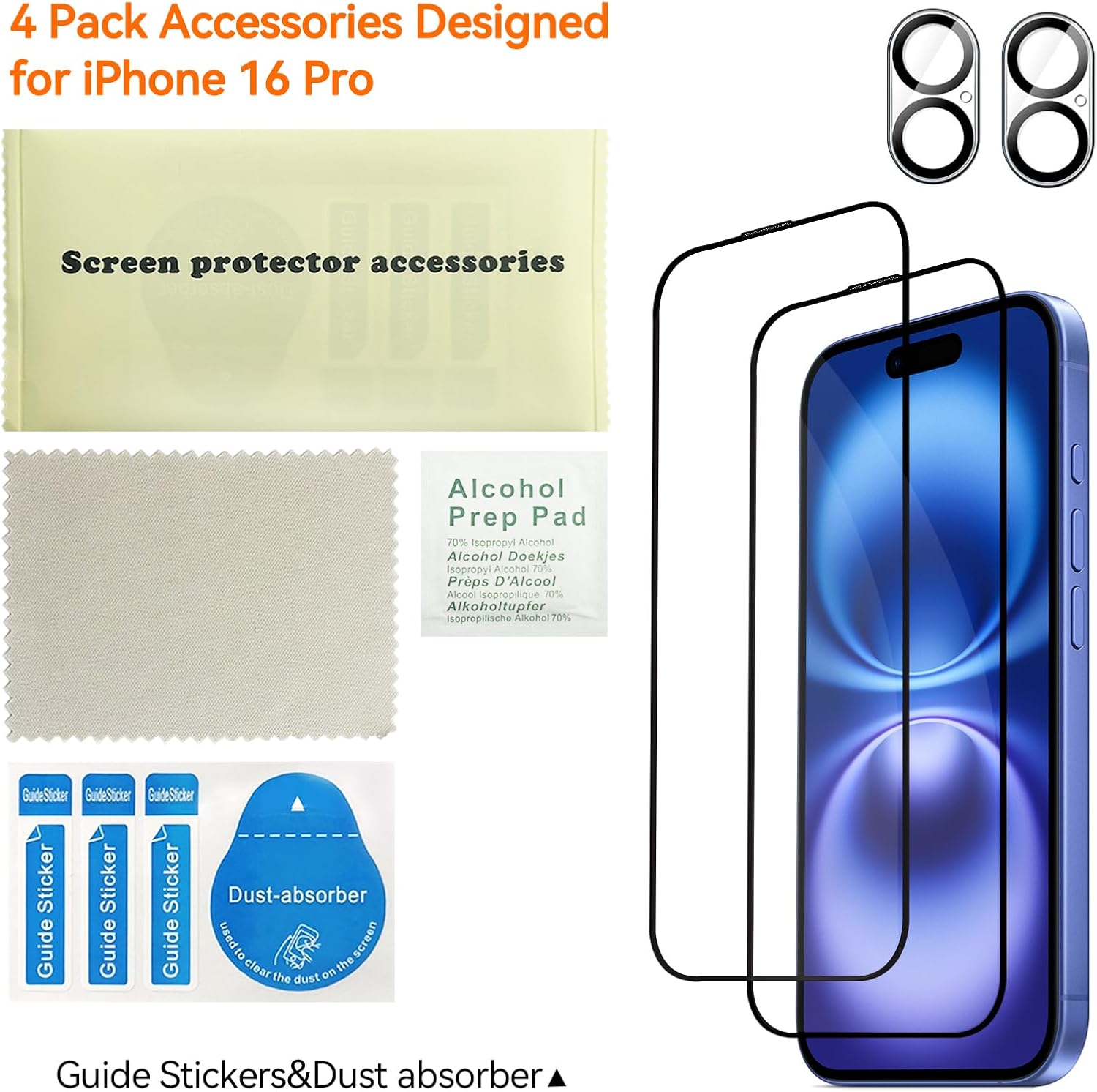 This product includes 2 pack iPhone 16 screen protector +2 Pack Camera Lens Protector and Wet/Dry Wipes, Dust Removal Stickers