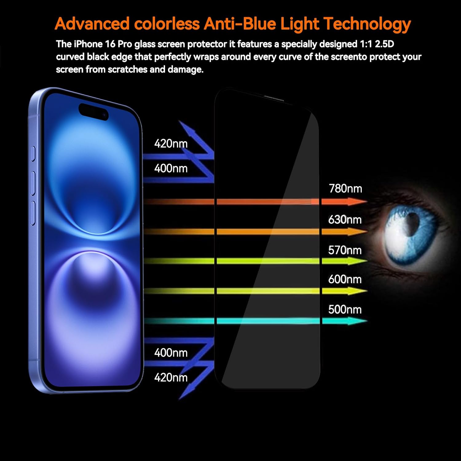 Screen Protector for iPhone 16 Colorless anti-blue light protective film is clear and non-reflective under the sun ensuring your display’s true colors remain vibrant and undistorted. can efficient block harmful blue light from digital screens to protect your eyes