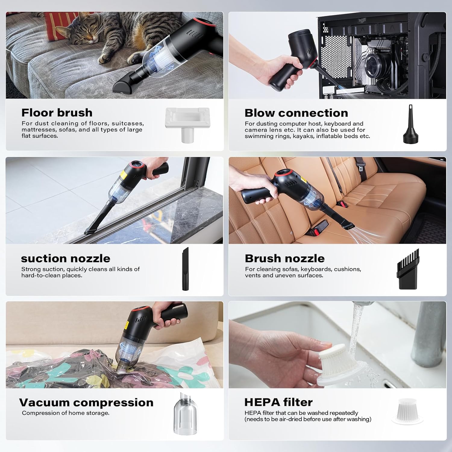 It can be a car hoover cordless powerful for daily cleaning of homes, vehicles and offices, a dust blower for cleaning camera lenses, etc.