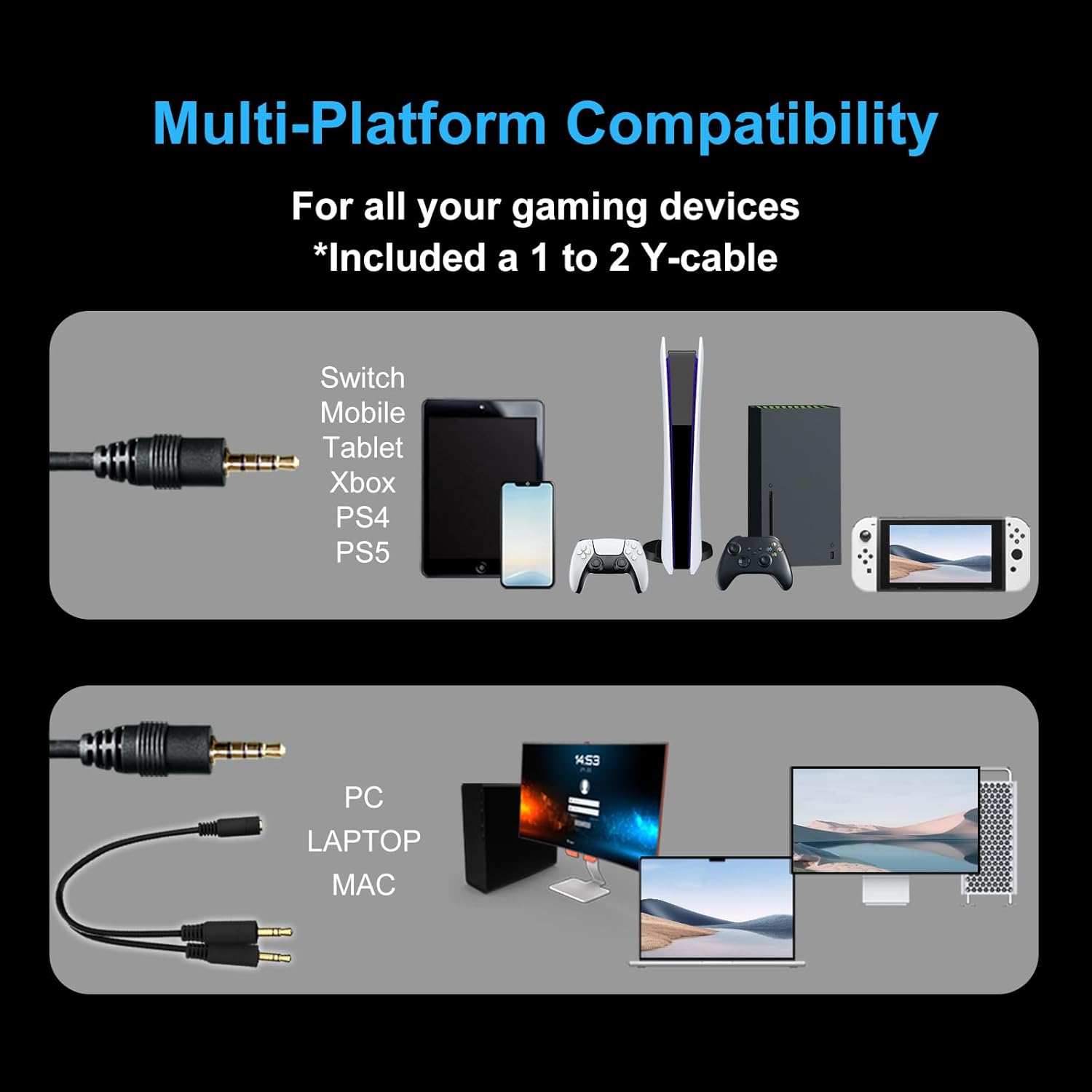 Included a 1 to 2 Y-Cable: It offers enhanced compatibility, allowing you to use the headset with desktops, laptops, and phones.