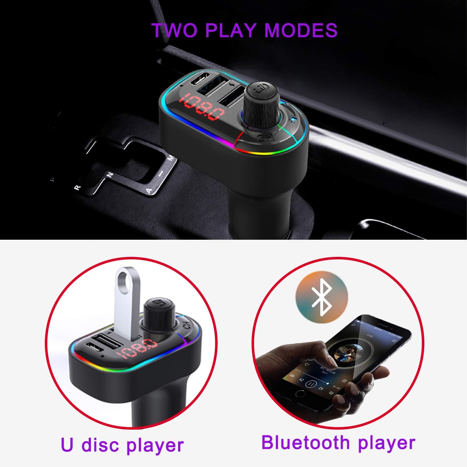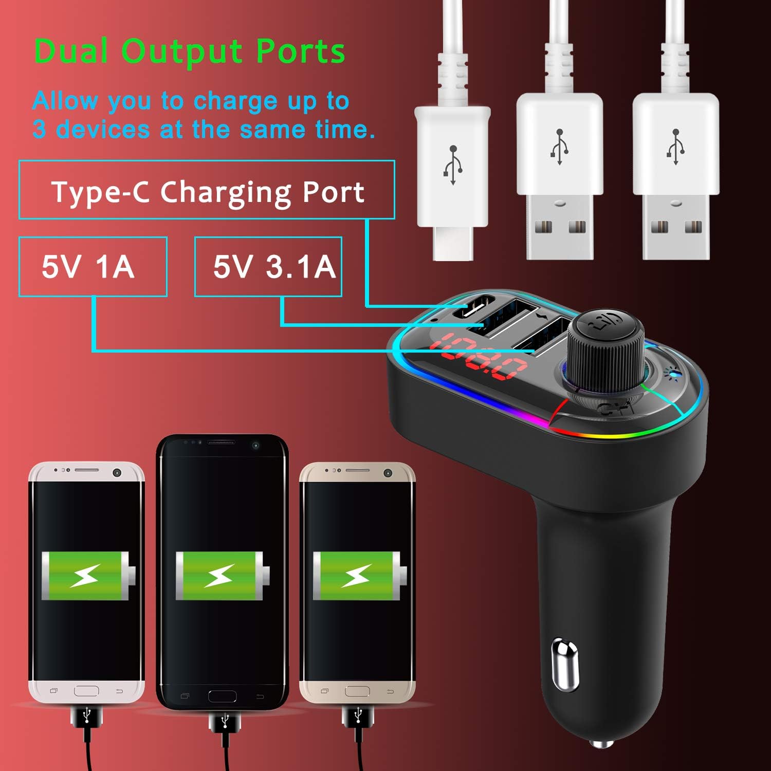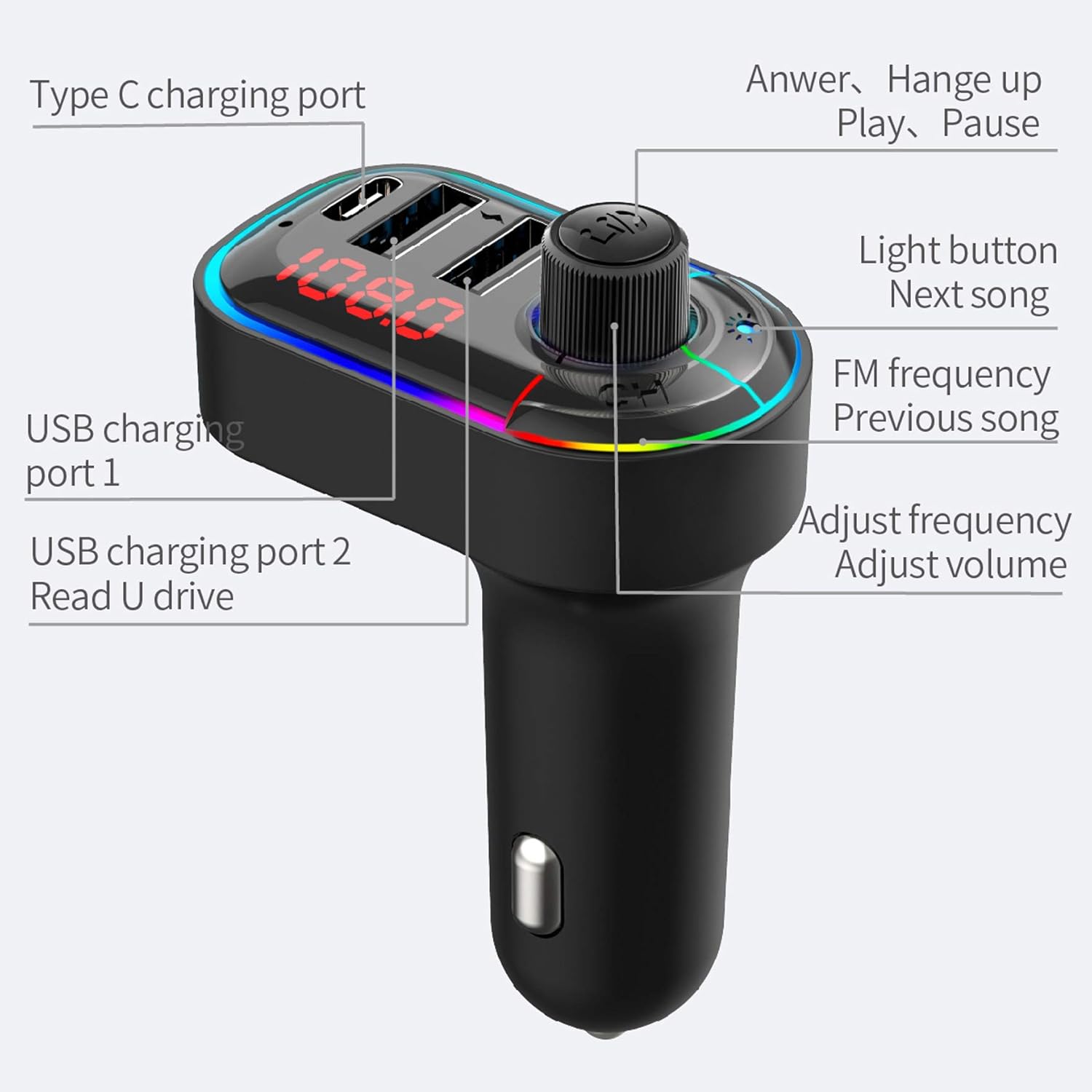 This Wireless Bluetooth FM Transmitter with 2 USB charge ports and 1 Type-c port which dual Fast Charge and the other one Standard Charger, 7 Colors LED Backlit for your car, Hi-Fi Music, Clear Hands Free Calls, Simple and Safe.