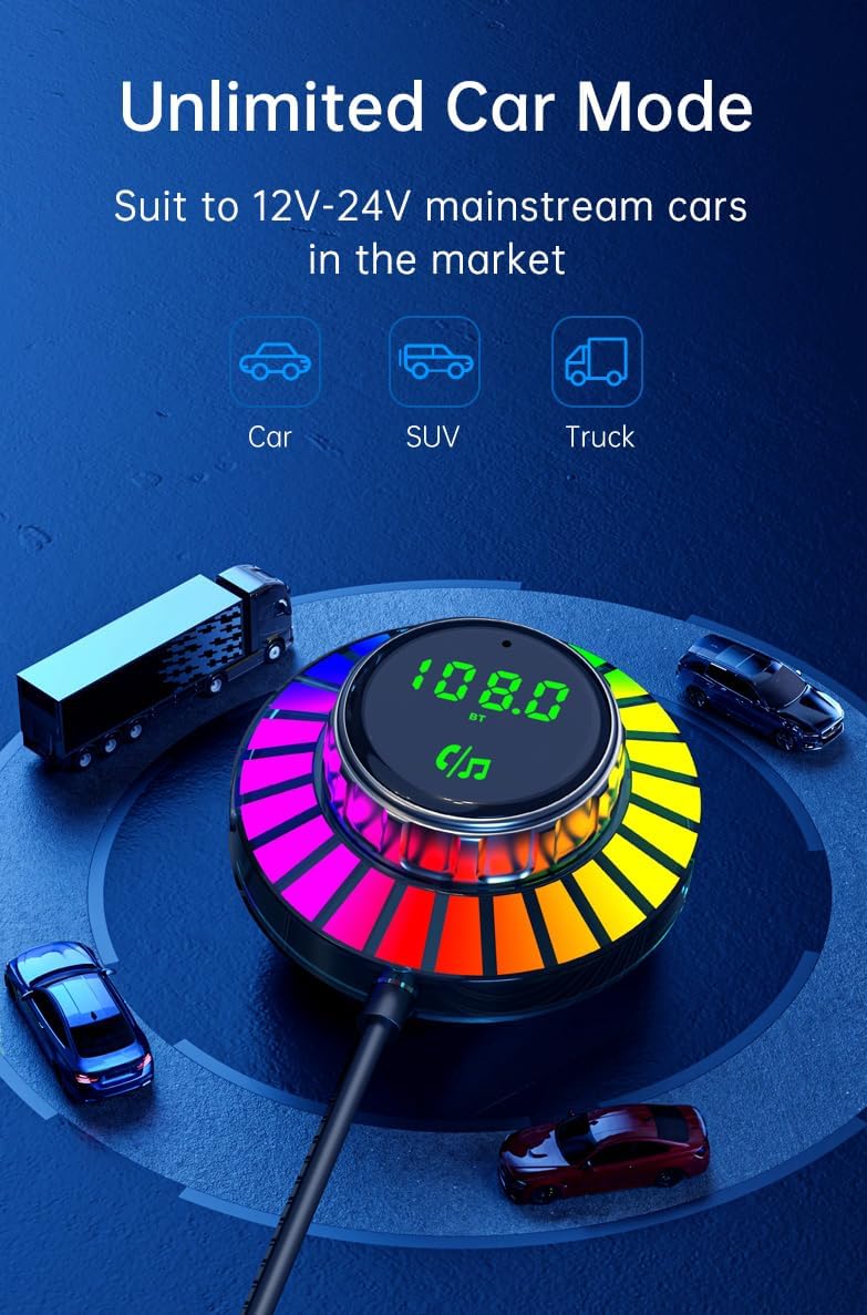 [6 Colorful Lights Modes] Press the light button on the 24 colored-LED fm transmitter bluetooth for car to enter the light change mode; There are 6 color modes, that you may choose any mode you like to decorate your space.