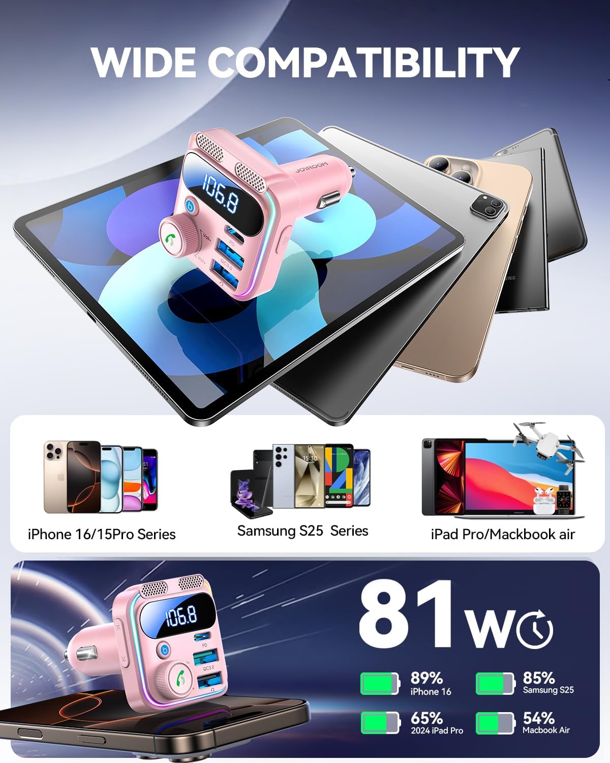 81W Fast Charge: This fm transmitter car bluetooth 5.4 is equipped with 45W PD3.0 and 36W QC3.0 fast charge ports, which can fast charge two devices at the same time and compatible with Samsung/iPhone/Xiaomi /Google and other fast loading protocols