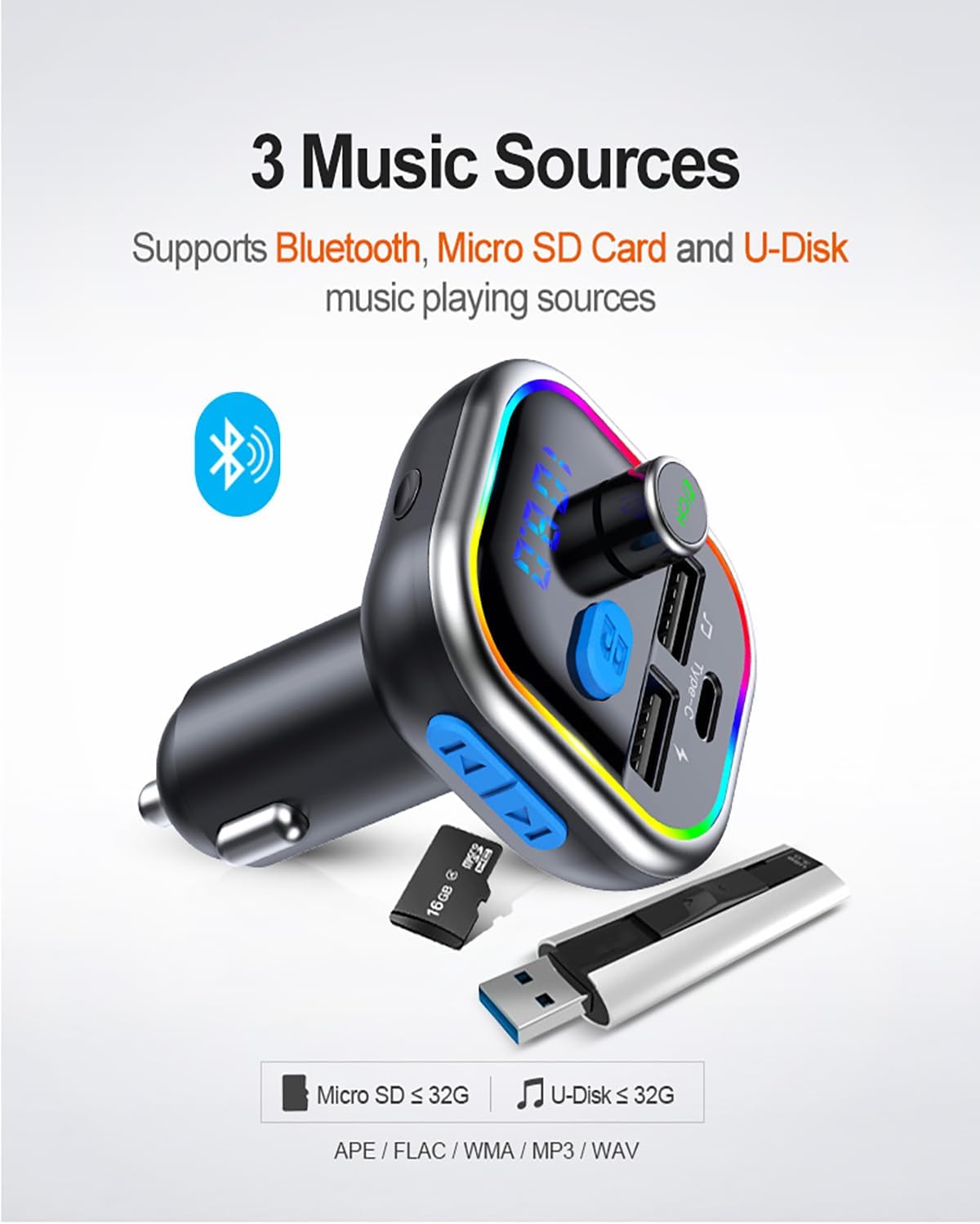 【PD 36W and QC 18W Fast Charging】 Designed with PD 36W and QC3.0 quick charge port as well as a normal 5V/1A USB port (U disk port), this Bluetooth FM transmitter enables you to charge 3 devices simultaneously while you are listening to music