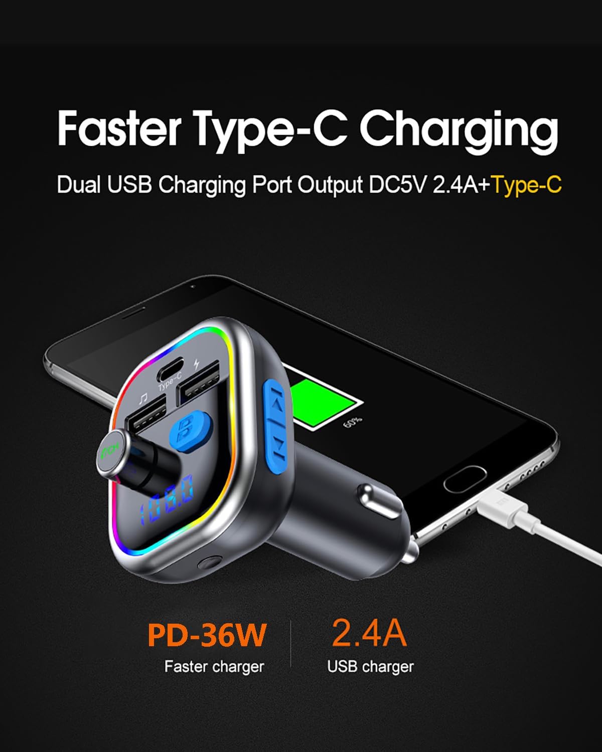 【PD 36W and QC 18W Fast Charging】 Designed with PD 36W and QC3.0 quick charge port as well as a normal 5V/1A USB port (U disk port), this Bluetooth FM transmitter enables you to charge 3 devices simultaneously while you are listening to music