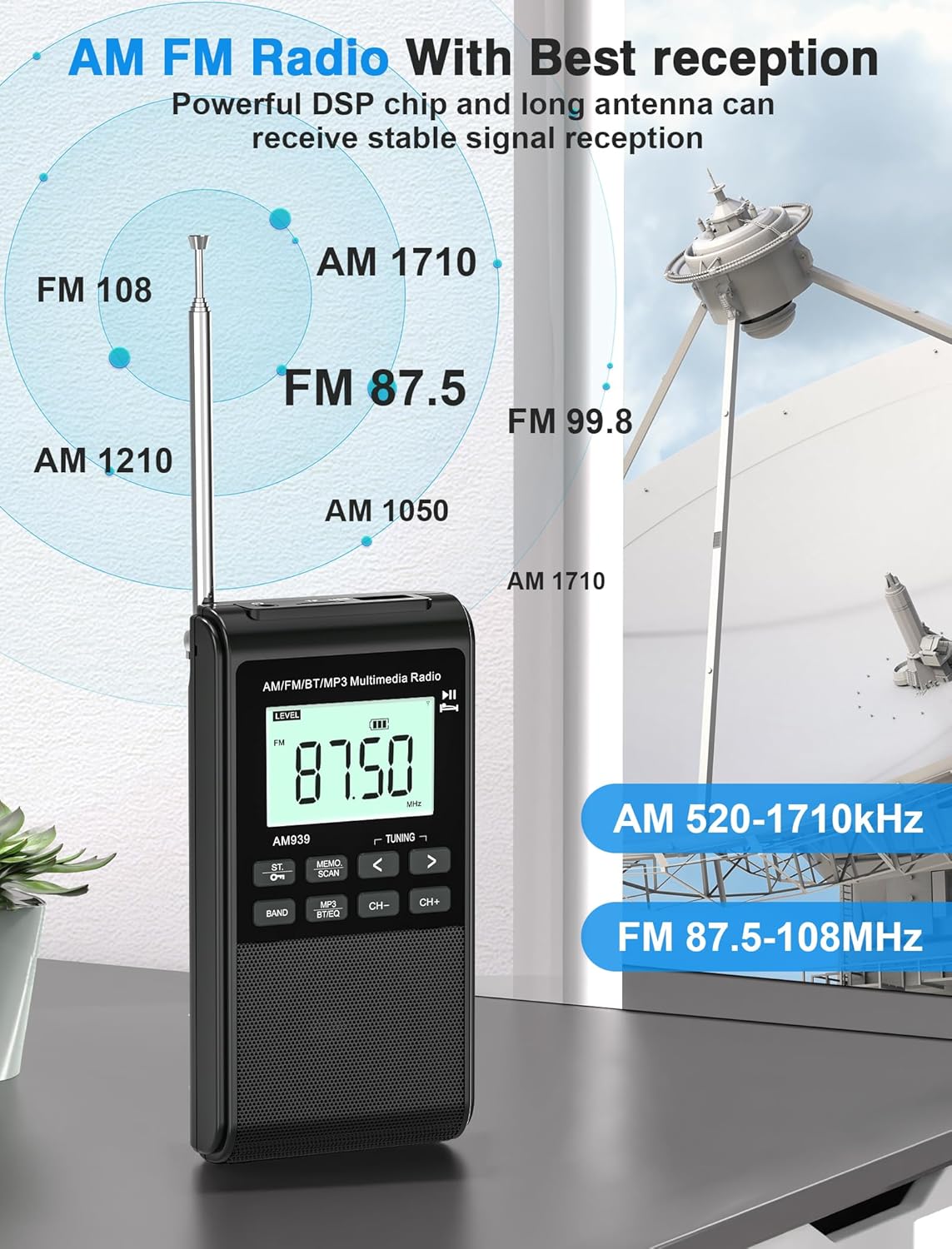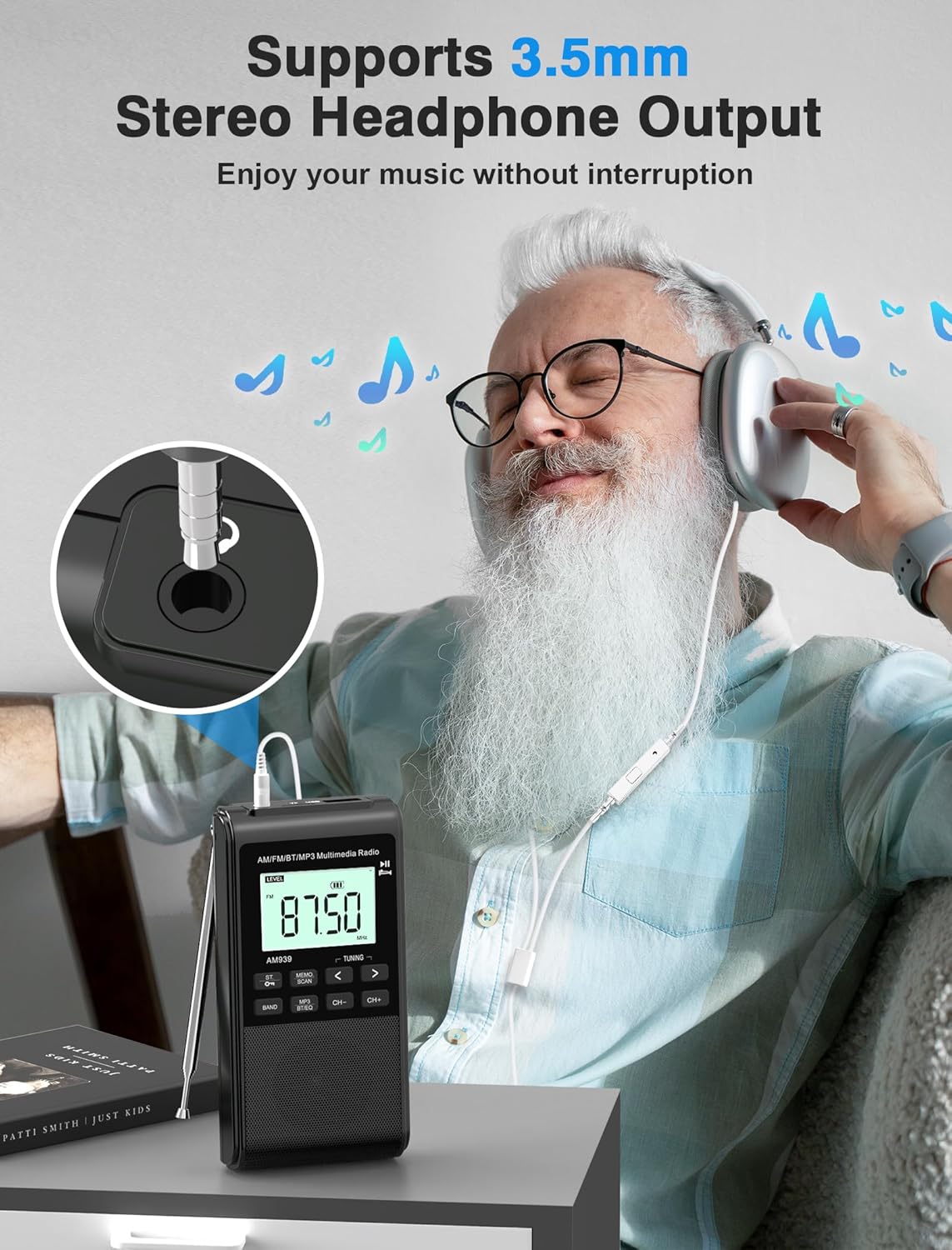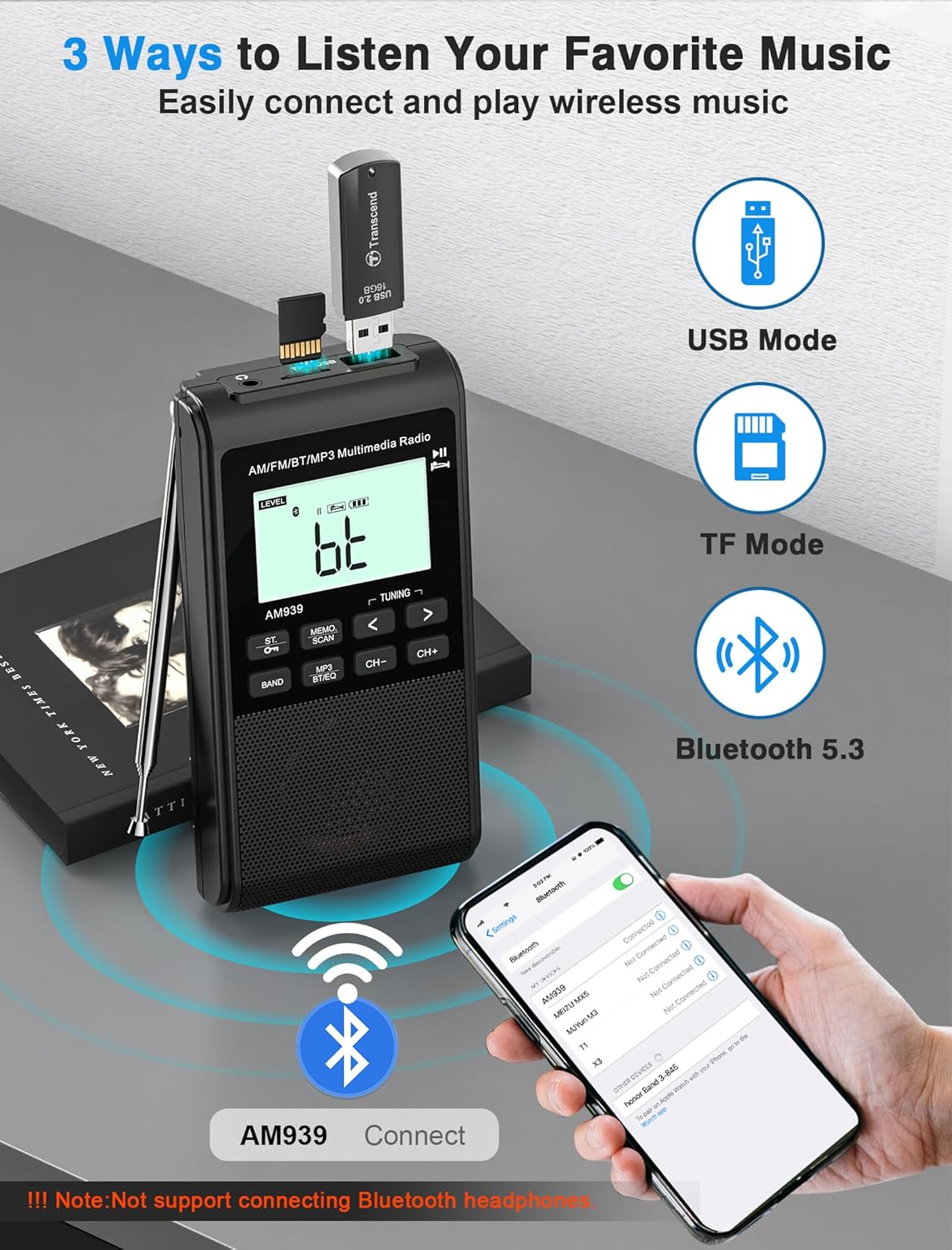 🎶【3-in-1 Versatile Playback: Bluetooth/USB/SD Card】More than just a AM FM radio, this radio supports multiple playback modes! You can connect your phone to the radio via Bluetooth and listen to your phone’s music through the radio.(Not support connecting Bluetooth Earphones), or play MP3 files from USB/SD cards (up to 32GB). Ideal for parties, workouts, or relaxing at home, it effortlessly switches between pocket radio and digital audio. The rechargeable radio also remembers playback progress, so you never lose your spot in podcasts or playlists.