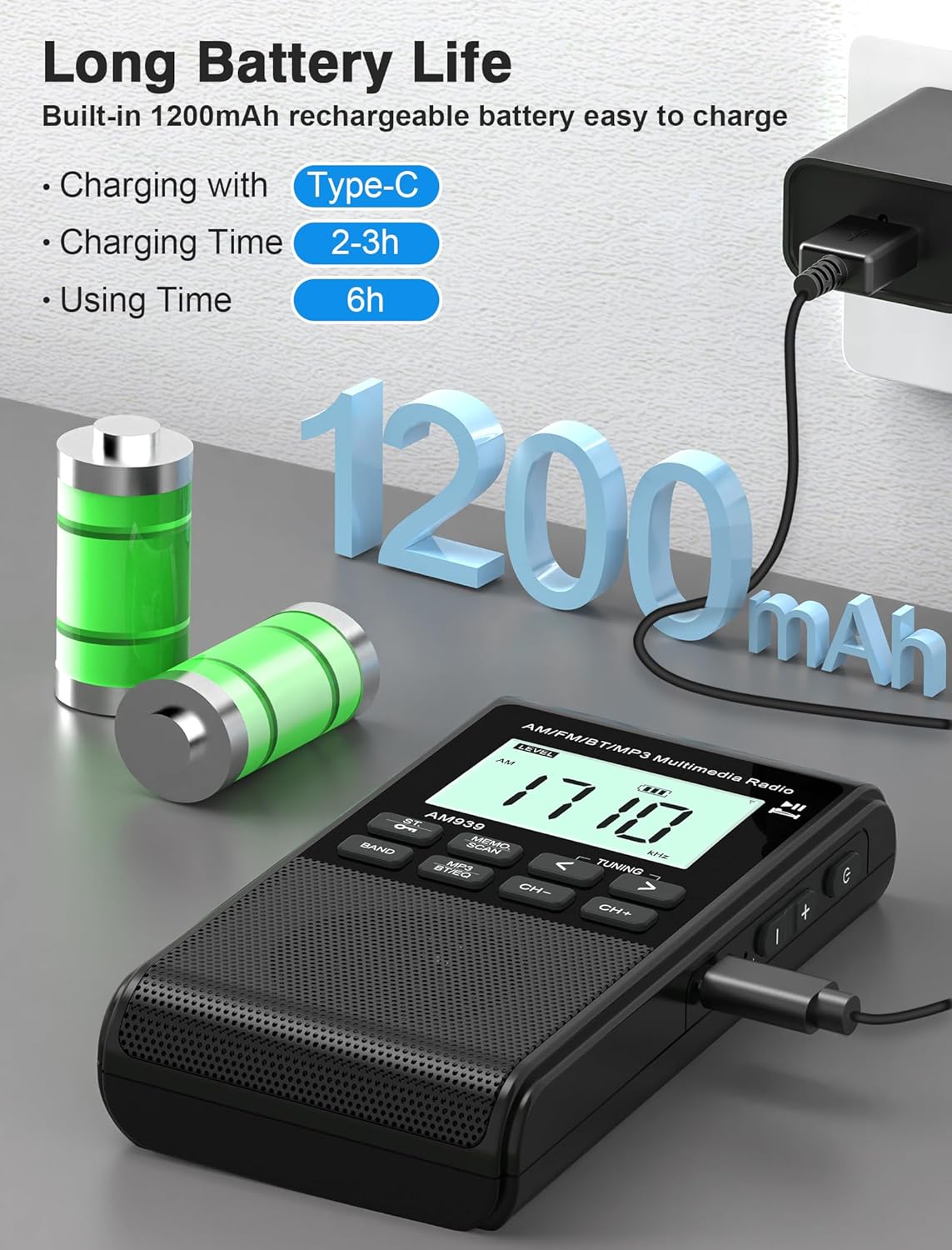 🔋【Long-Lasting 1200mAh Battery & Portable Design】Built with a 1200mAh rechargeable battery, this pocket radio offers up to 7 hours of continuous play (varies by volume). Charge via USB-C (cable included) and take it anywhere—its compact size, included wrist strap, and foldable stand make it perfect for camping, travel, or daily commutes. Never miss a broadcast or song thanks to its lightweight, on-the-go convenience!