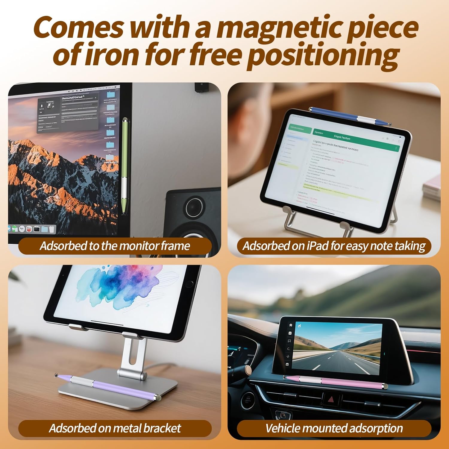 【Magnetic Function, Free Fixation】The stylus has its own magnetic suction that can be easily attached to the metal frame of devices such as iPad/iPhone. It also comes with 3 universal magnetic patches, allowing you to freely fix it on surfaces such as desks, notebooks, and drawing boards. Say goodbye to the trouble of traditional styluses being easily lost. When inspiration strikes, you can reach it with just one touch, making creation more efficient!