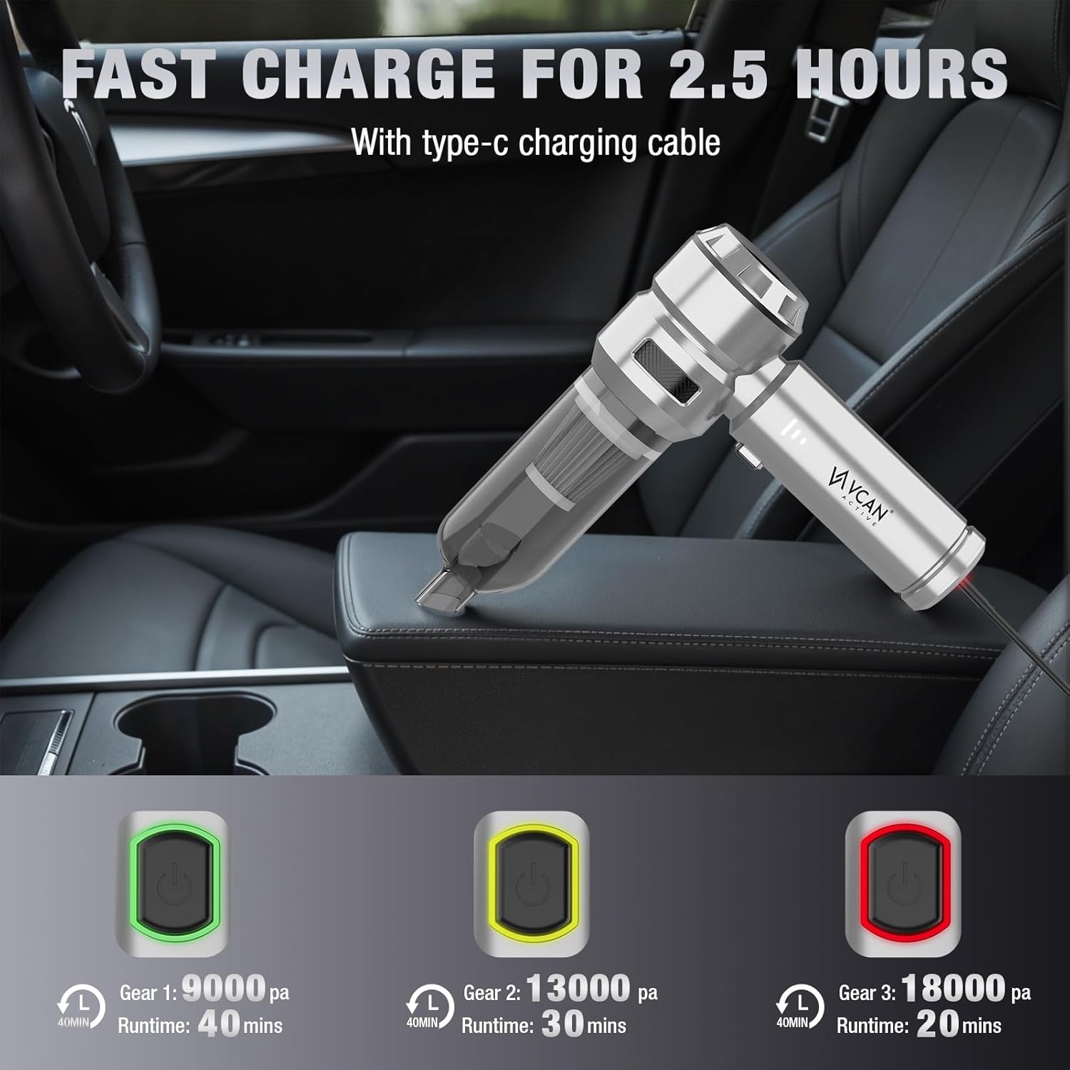 1.Type-C fast charging (3hrs full); 2.Includes 12V car charger – plug into cigarette lighter while vacuuming.