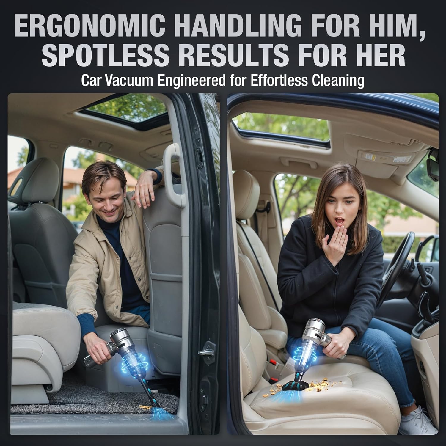 Powerful Suction: Our car vacuum portable cordless features a high-performance motor that delivers strong suction, efficiently picking up dirt, crumbs, and debris from every corner of your vehicle. Keep your car spotless with minimal effort