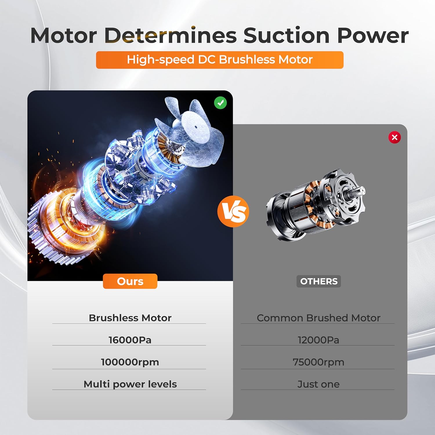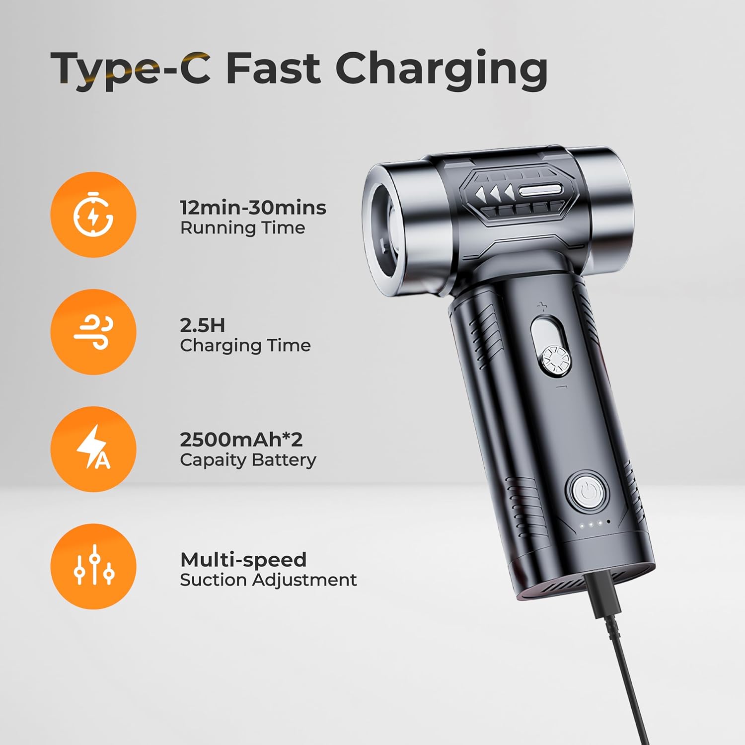 Powerful 16000pa Suction: With an 80W(max) motor spinning at 100,000 RPM, this car vacuum cleaner delivers up to 16000pa suction, effortlessly picking up dirt, pet hair, crumbs, and debris from car interiors, carpets, and upholstery.