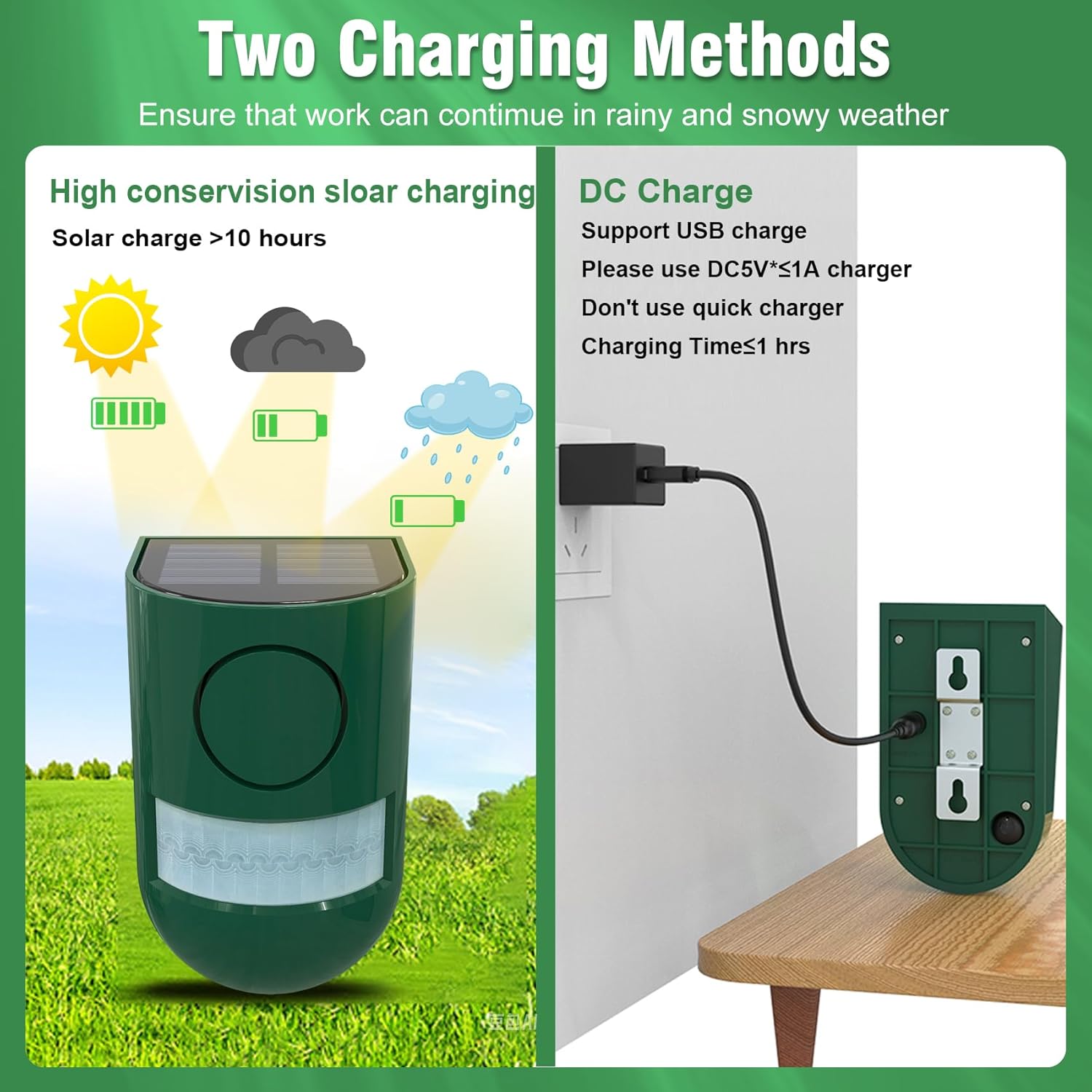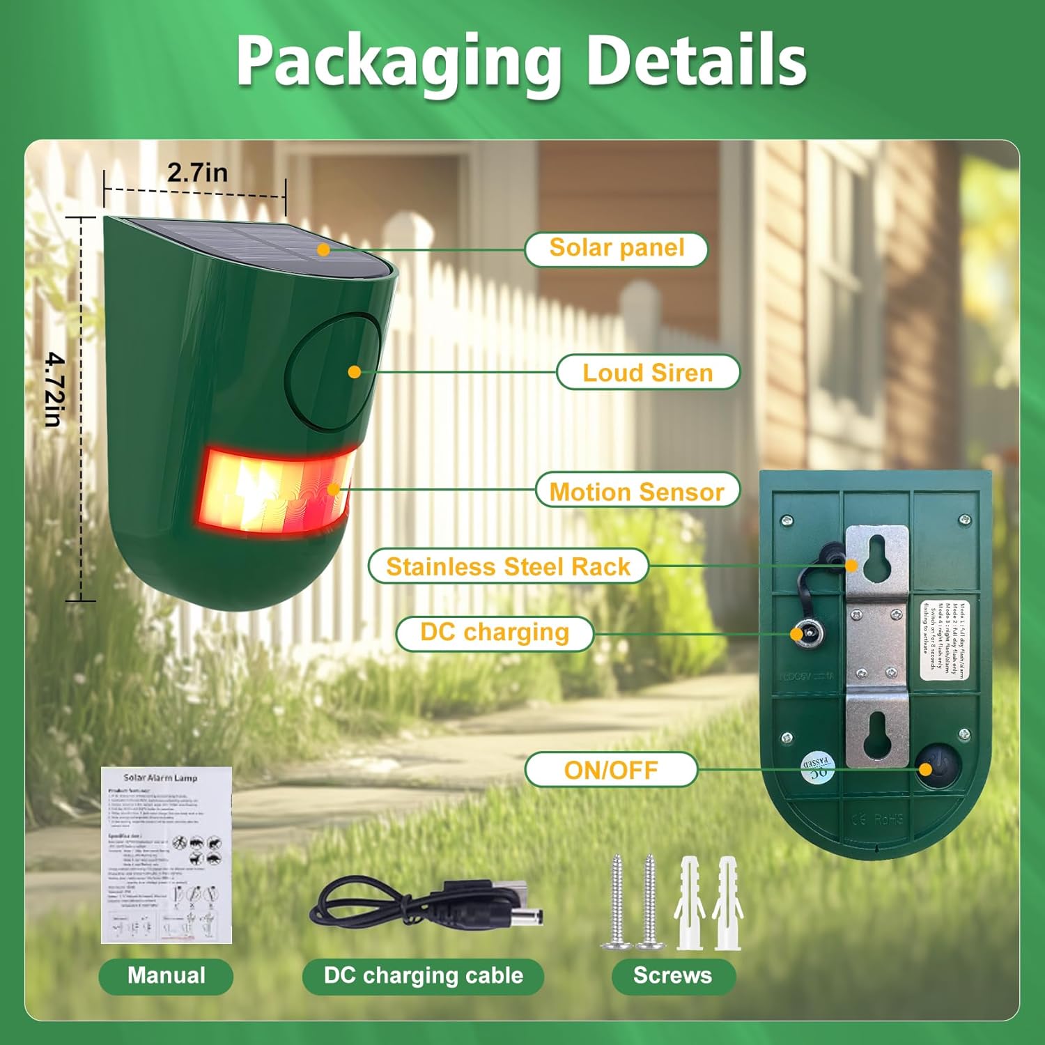 IP65 Waterproof and Durable:Constructed from high-quality ABS plastic with an IP65 waterproof rating,this solar alarm motion detector with sound withstands rain, snow, and other outdoor conditions, providing long-lasting garden protection.Low maintenance