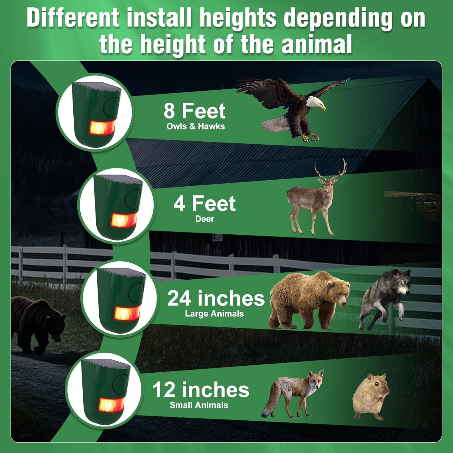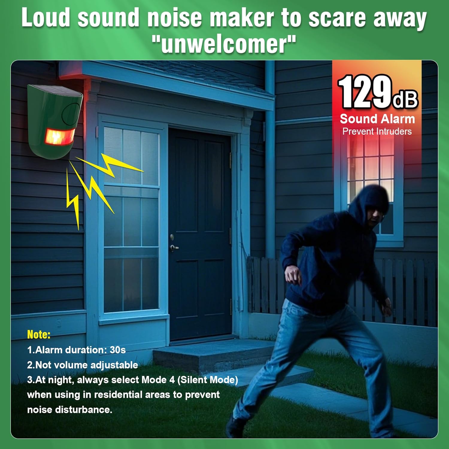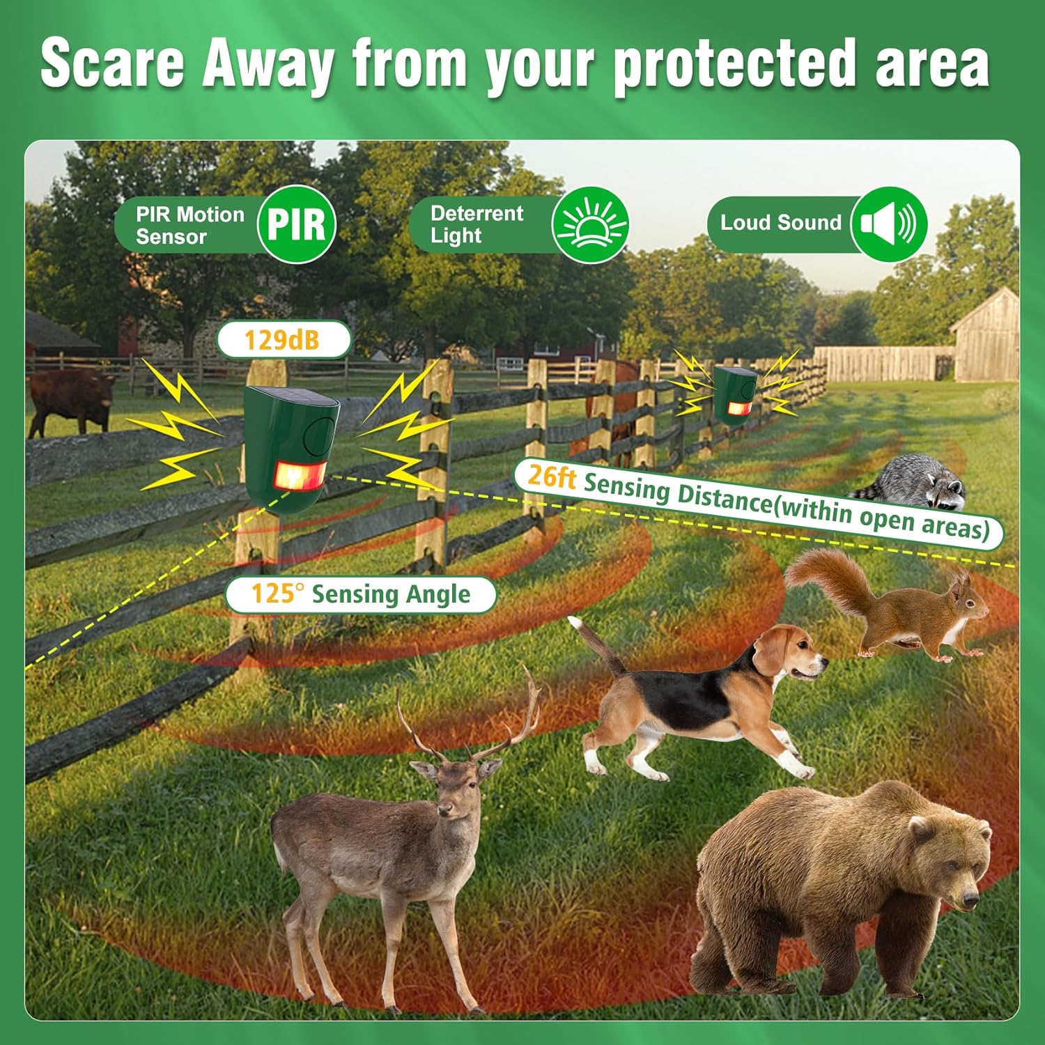 Solve 99% of Animal Invasion Worries:This motion sensor alarm outdoor detects movement within a 125-degree arc and up to 26 feet, emitting 129dB loud sound noise maker and strobe LED light to scare away animals like deer,dogs, bear,raccoons and coyote from your yard or garden