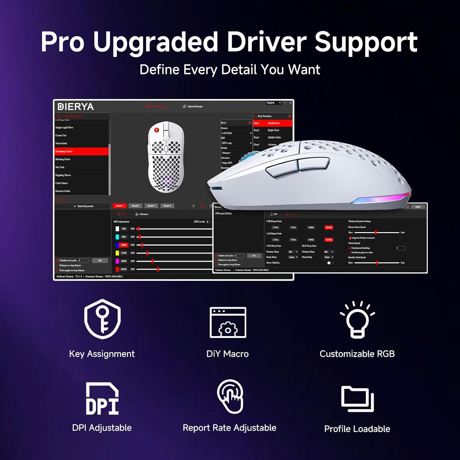 Fully Programmable & RGB Lighting:Personalize all six buttons with macros and remapping using the dedicated driver software. Adjust DPI levels, report rate (125–1000Hz), and sleep timers to your preference. Choose from 13 vibrant lighting effects, including Breath, Static, Flow, and Starlight, with 16.8 million colors to create the perfect gaming atmosphere.
