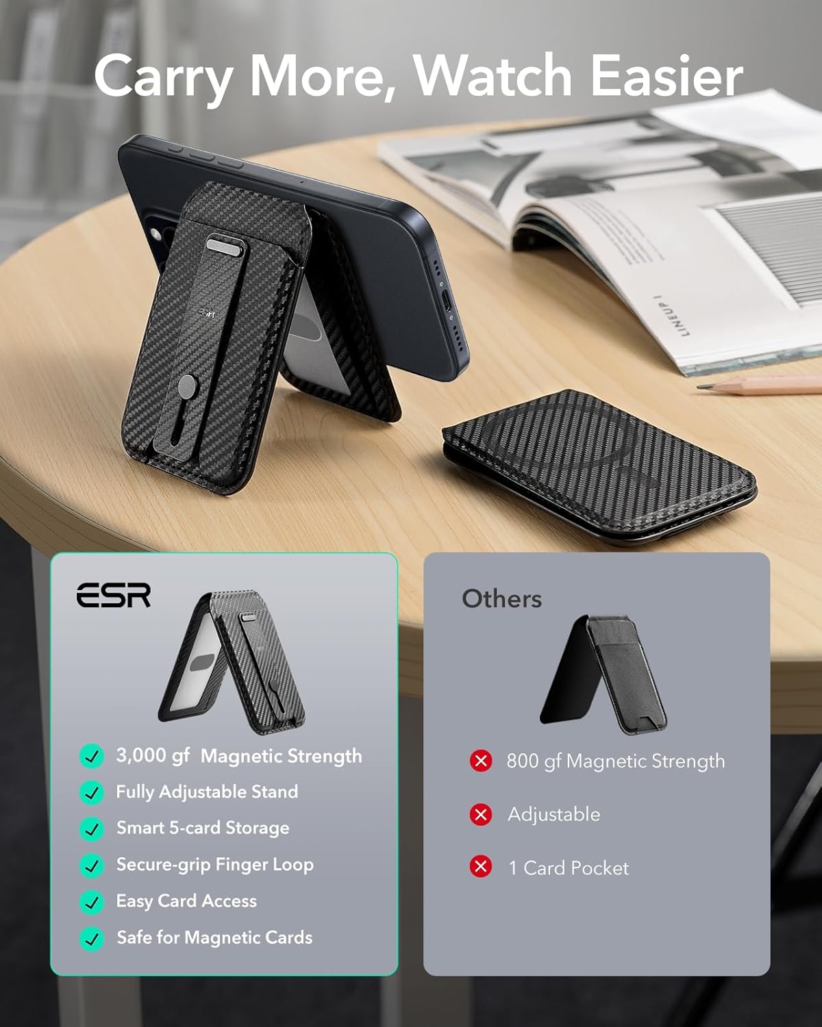 Upgraded Stronger Magnetic Lock: with 3,200 g of holding force (with ESR magnetic cases), it’s 275% stronger than the official magnetic wallet, ensuring a secure attachment for your wallet stand; not compatible with Find My