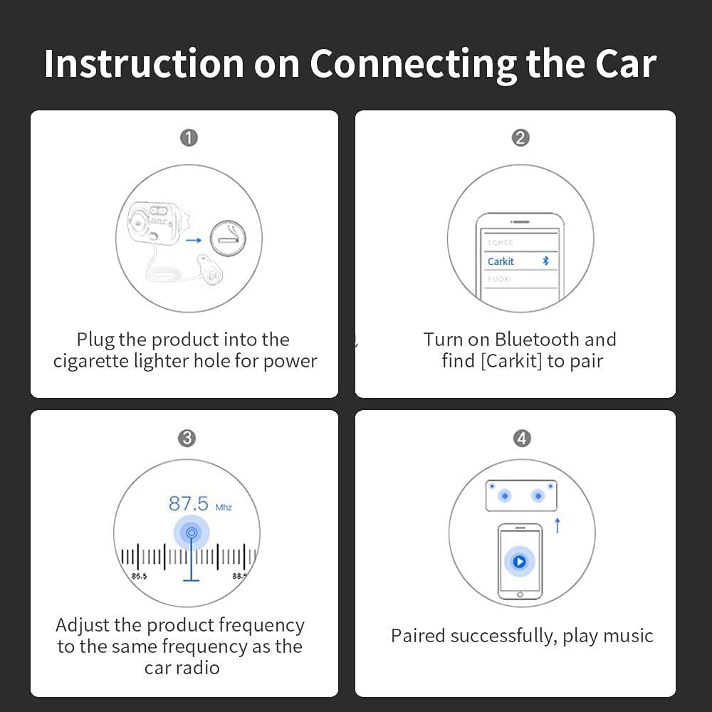Plug the product into the cigarette lighter hole for powerTurn on Bluetooth and find [Carkit] to pairAdjust the product frequency to the same frequency as the car radioPaired successfully, play the music