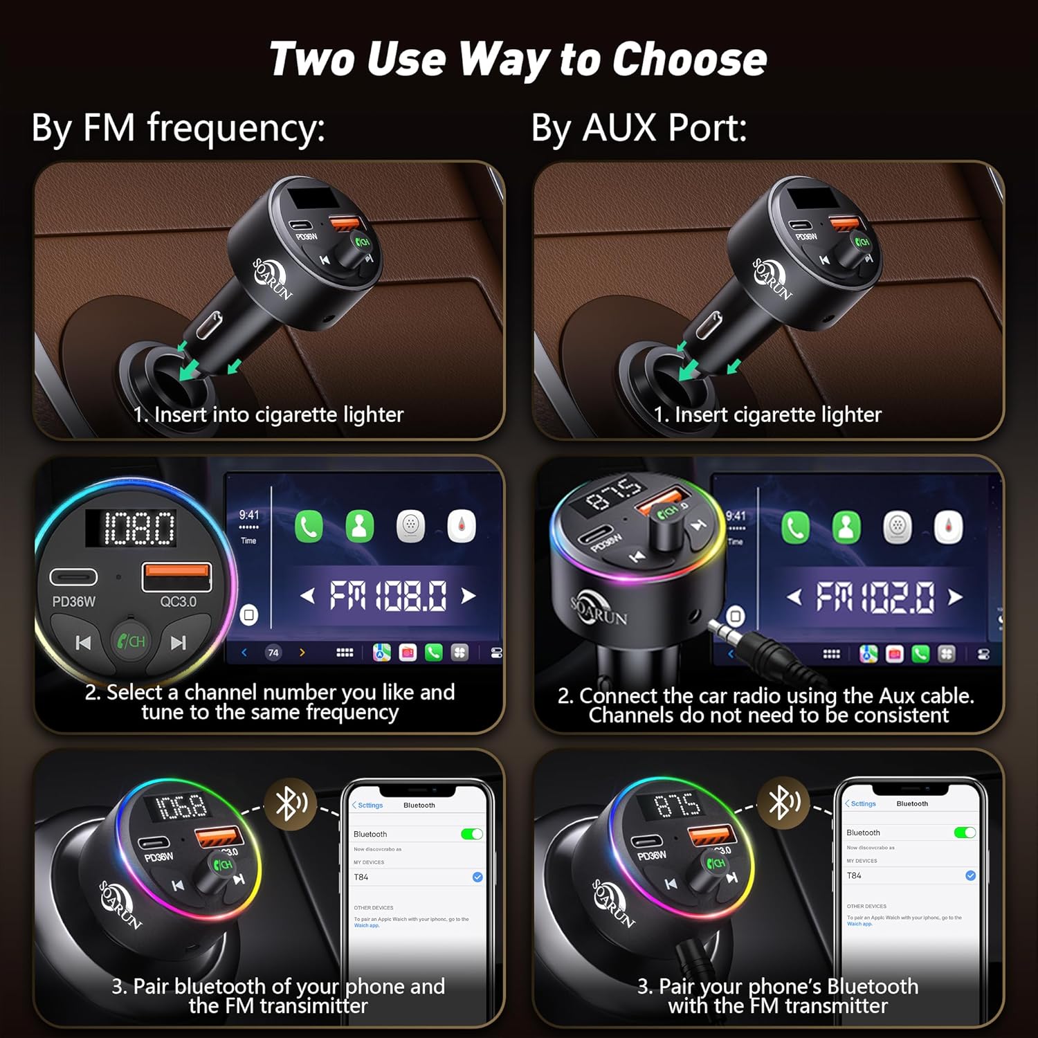 【54W Fast Charge】SOARUN bluetooth FM transmitter for car is equipped with dual PD 36W and QC3.0 18W fast charge ports which can compatible with Samsung, iphone, ipad, Sony, ipods and other fast charging protocols.Note: When two charging ports are used at the same time, the maximum output is 36W