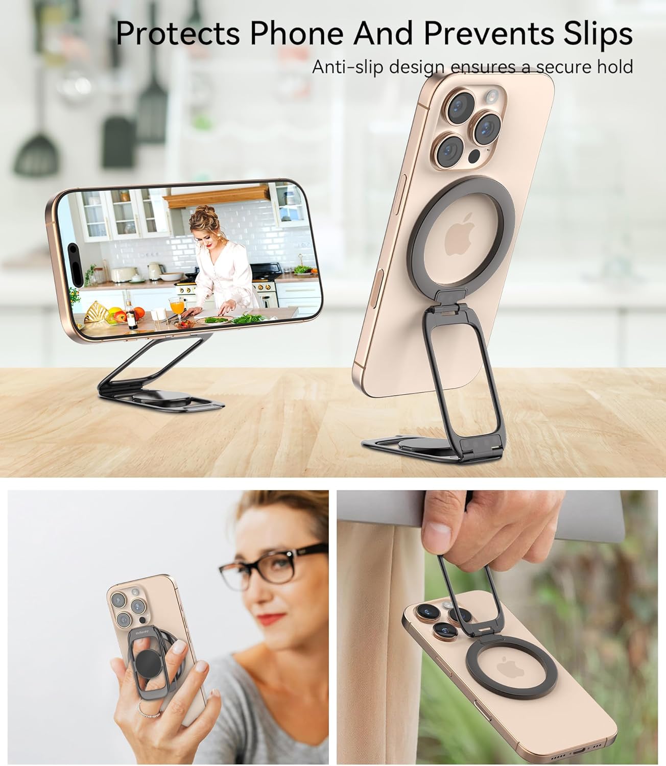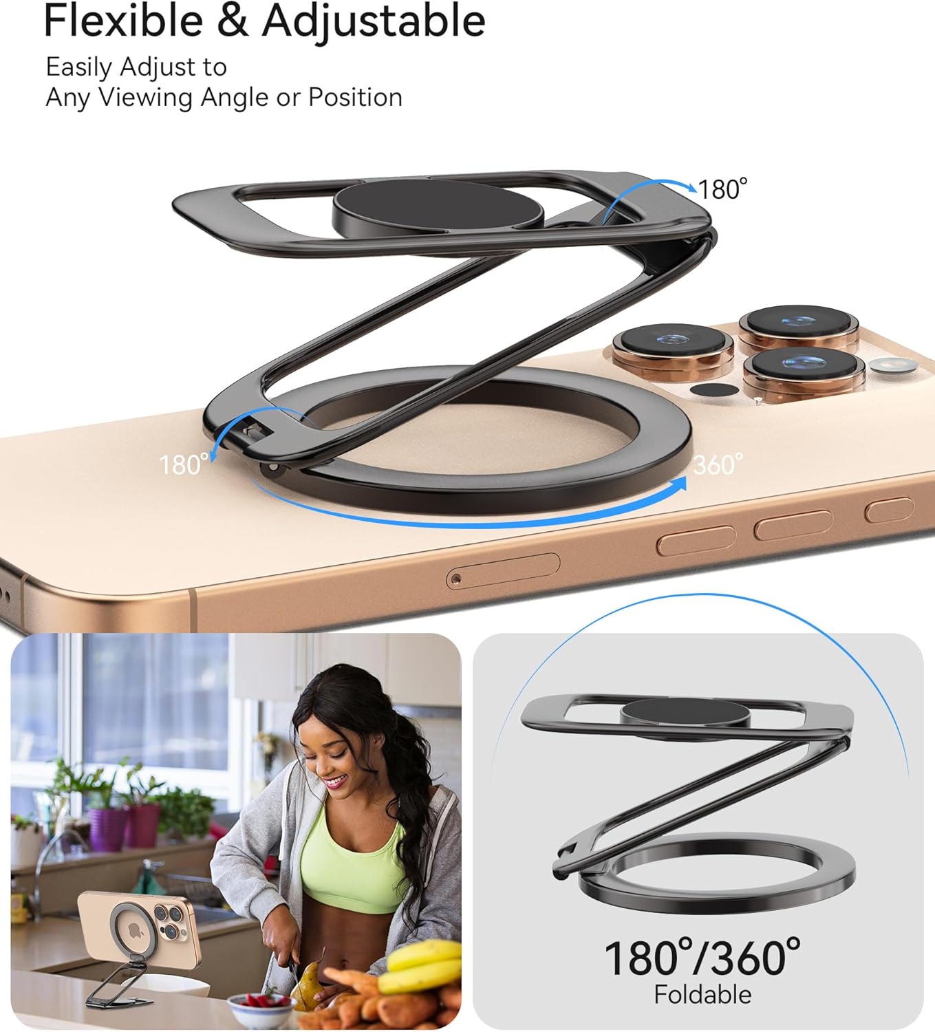 [Triple-Layered Rotating Design – Foldable & Functional] Features a patented 3-part structure: magnetic base + dual ring system + stainless steel precision pivots. 360° rotation with adjustable angles, foldable for travel and pocket-friendliness. Whether you prefer landscape or portrait mode, this magnetic phone stand allows you to view your phone from any angle.