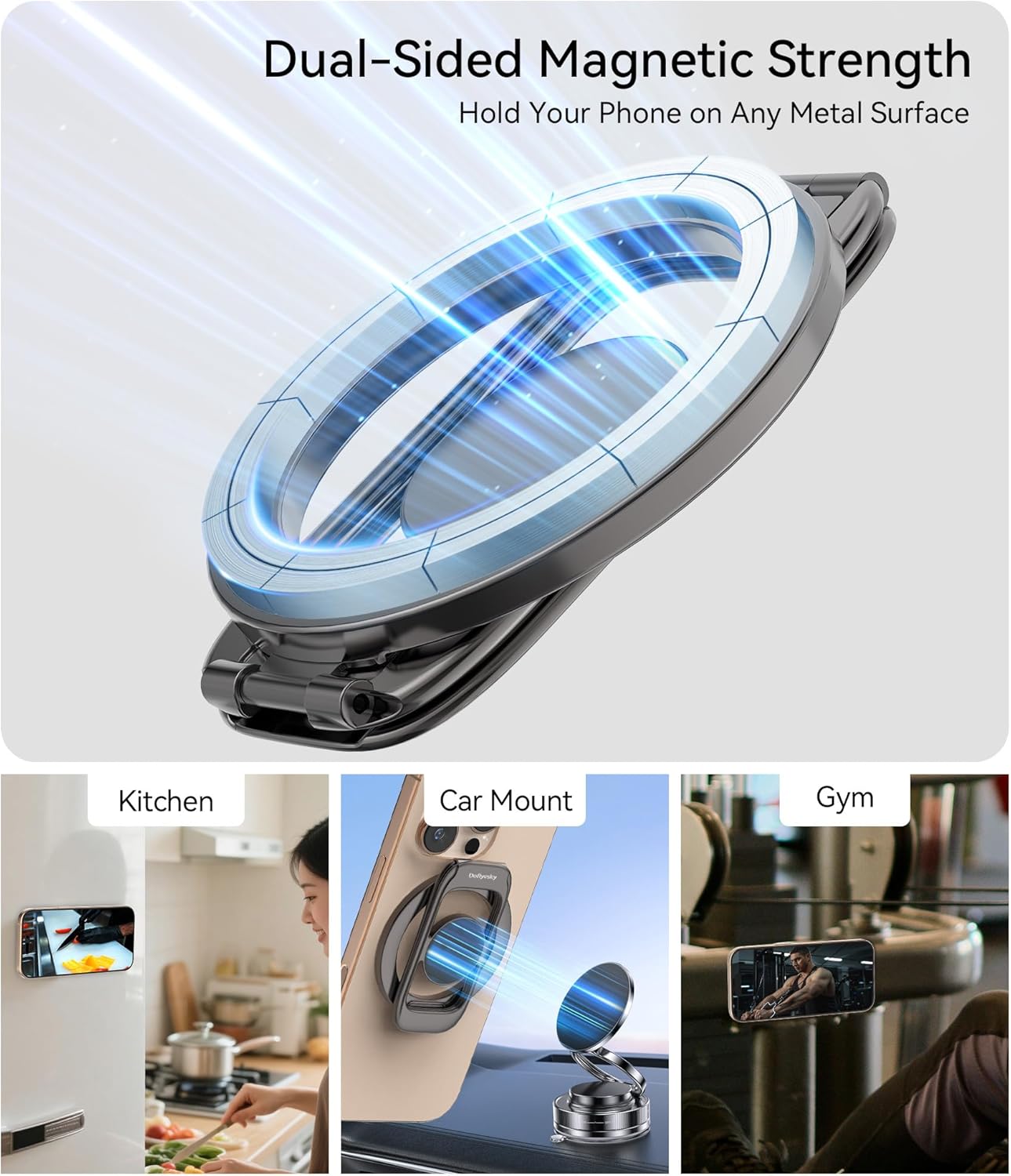 [Ultra-Strong Resistance] The magnetic phone ring stand tested to withstand 50,000+ folds. Each hinge supports 2kg resistance, delivering stable use for years without loosening. Simply stand it upright on a desk or attach it to a magnetic surface for hands-free use. Perfect for video calls, watching movies, YouTube, scrolling on TikTok, taking selfies, FaceTime someone, or following workout routines.