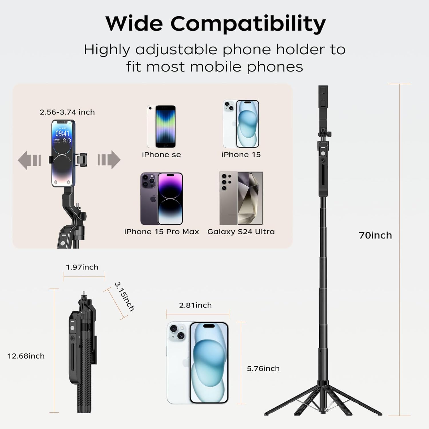 {70” Selfie Stick Tripod & Adjustable Angles } The auto face tracking features 360°phone holder design that supports both horizontal and vertical clamping of mobile phones. Also, Adjustable length from 12.68 to 70.86, free your hands for video recording or live streaming.